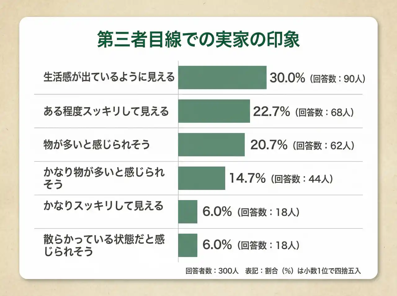 | 【結果6】第三者目線は生活感がある30.0%(90人)が最多。物量への印象も一定数 | |||