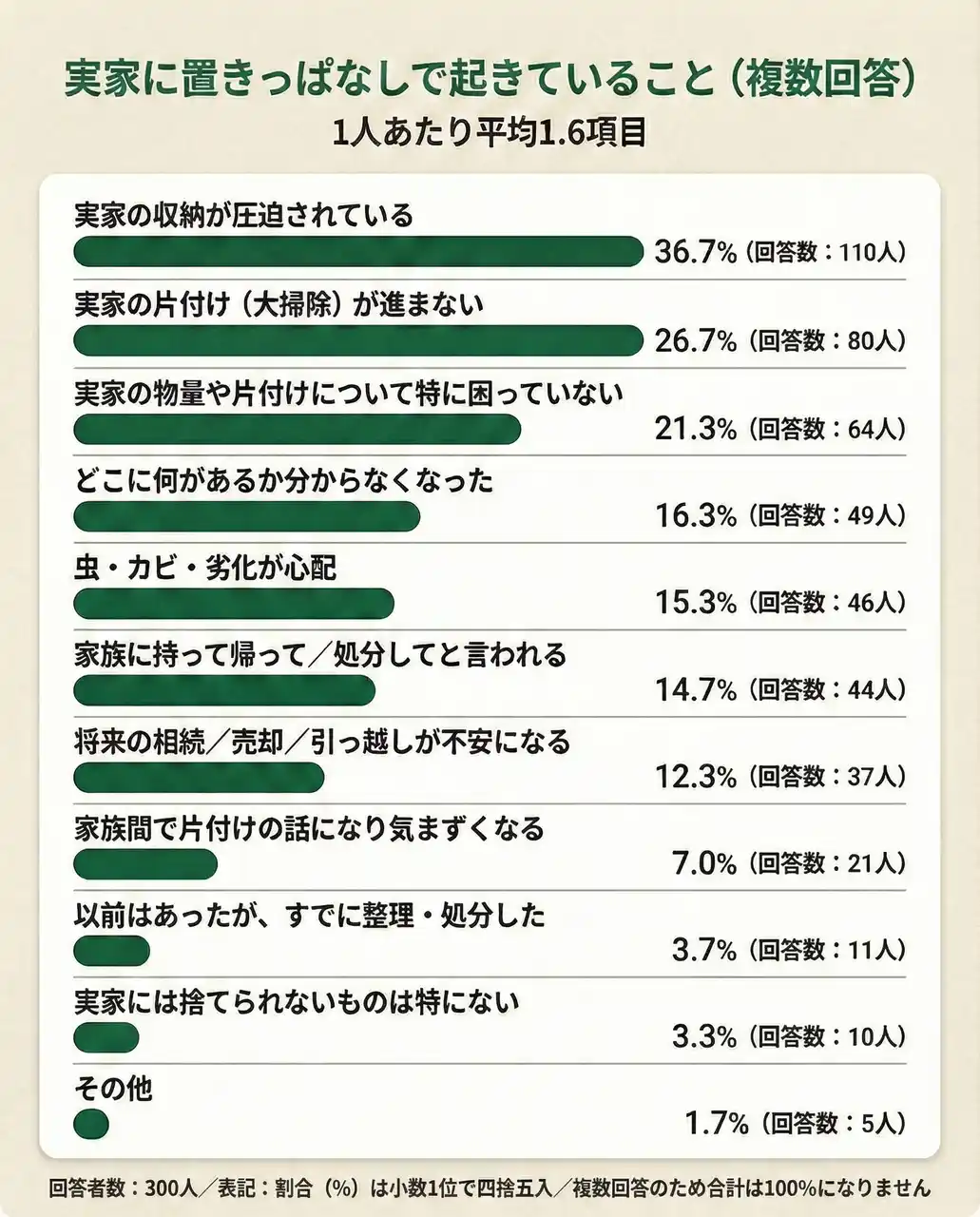 | ・実家に置きっぱなしで起きていることは収納が圧迫36.7%(110人)が最多 | |||