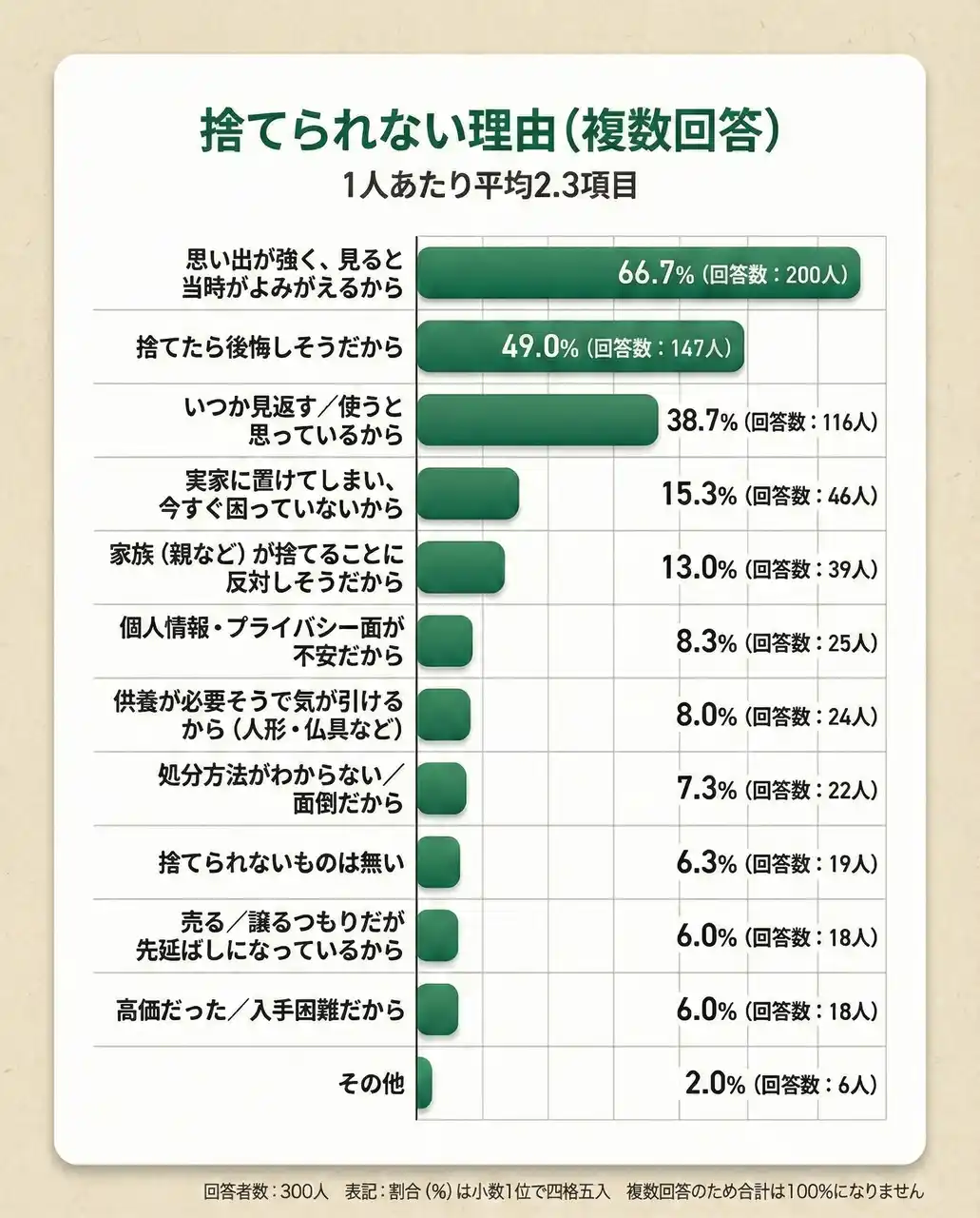 | ・捨てたら後悔しそうだから…49.0%(147人) | |||