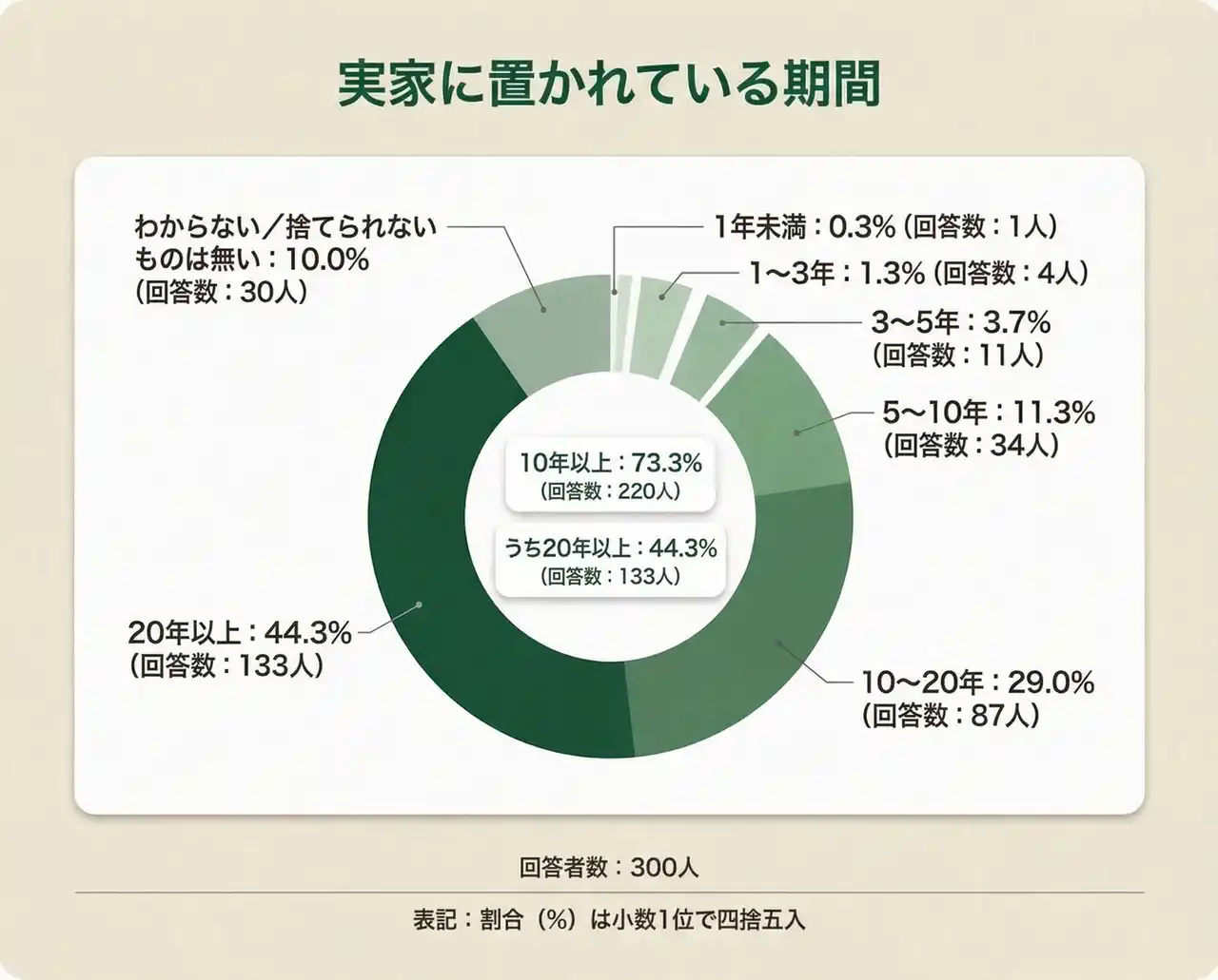 | 【結果3】実家に置かれている期間は10年以上73.3%(220人)。うち20年以上44.3%(133人) | |||