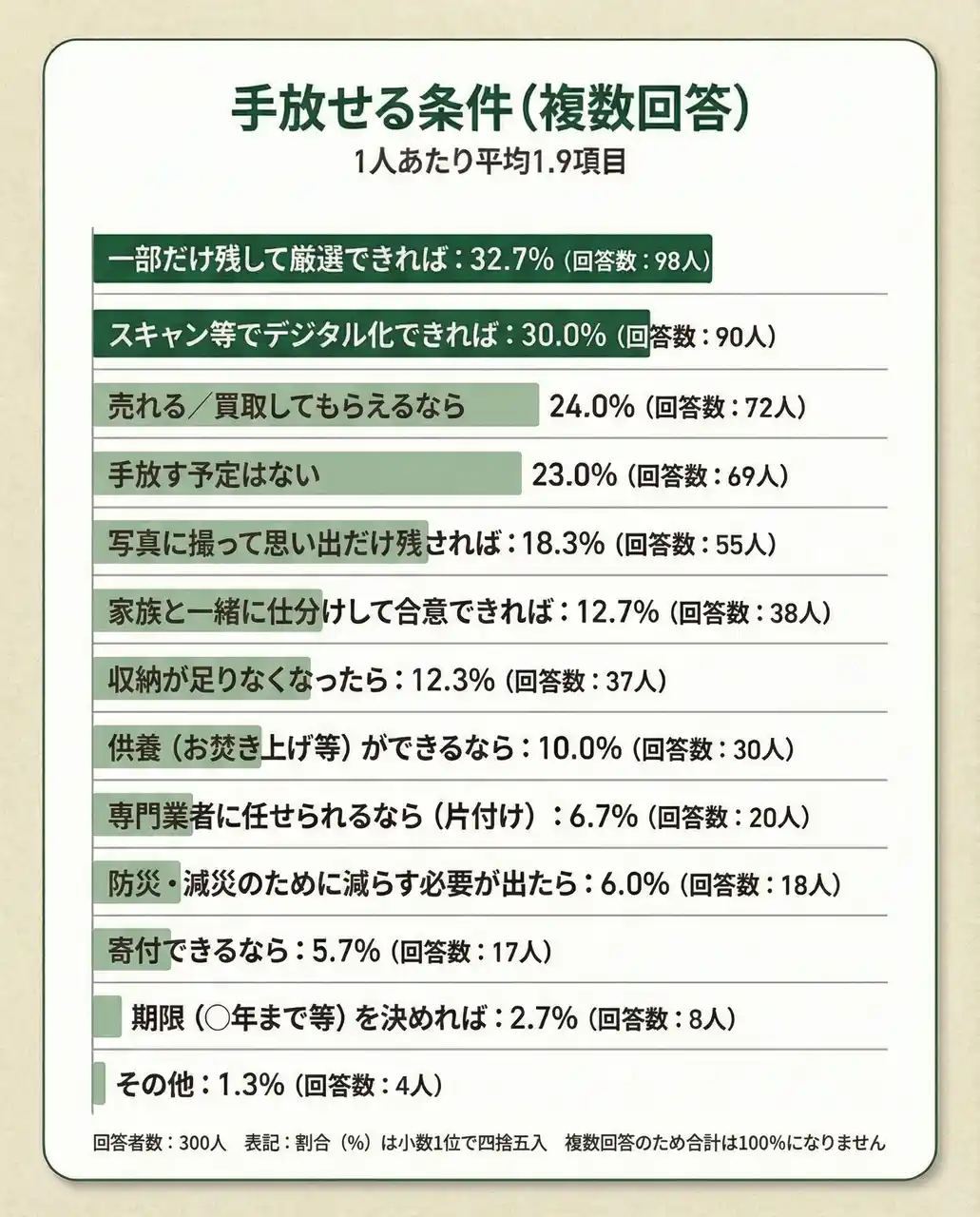 | 【結果5】手放すきっかけは一部だけ残す32.7%(98人)、デジタル化30.0%(90人)など思い出を残しながら整理が鍵(複数回答) | |||
