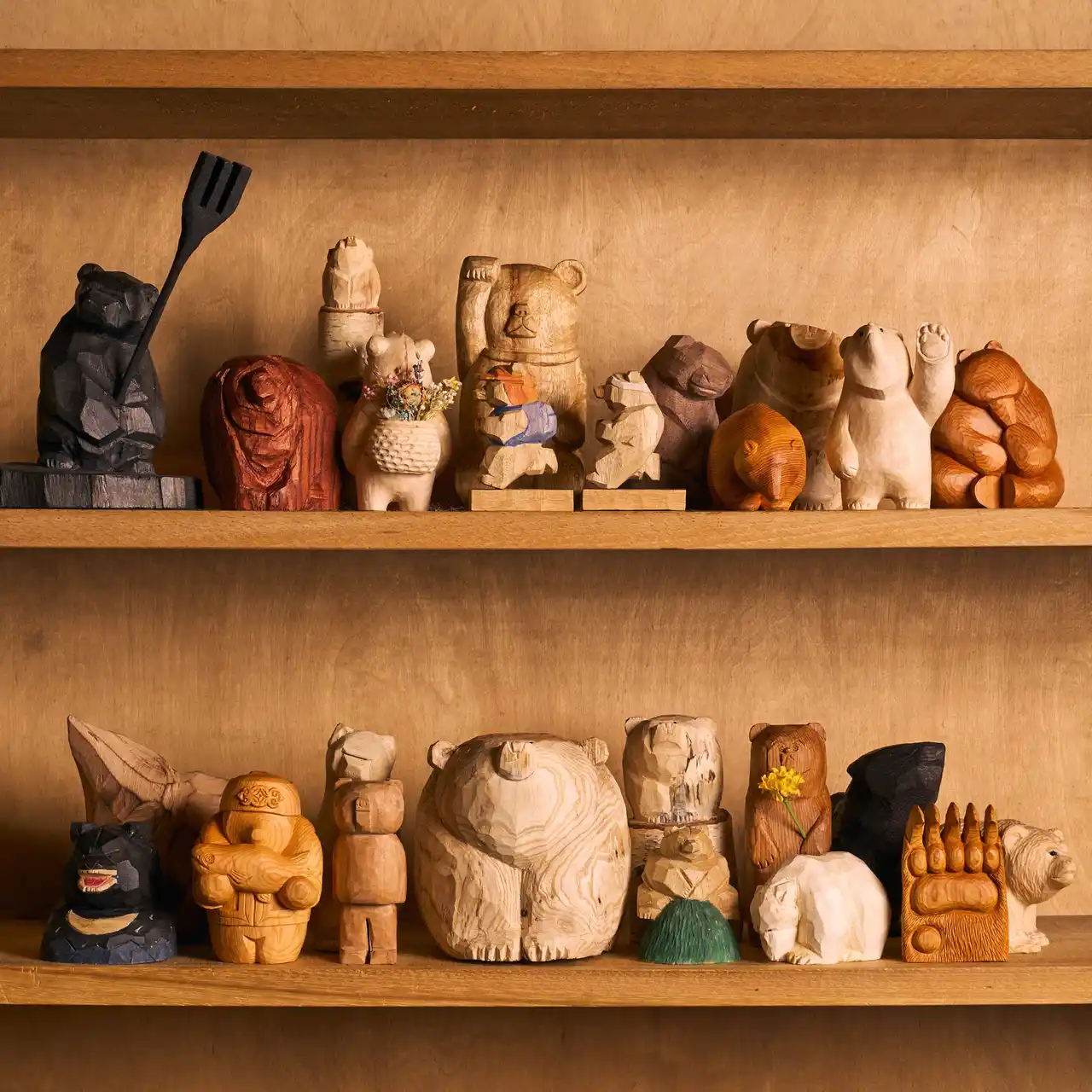 この時期の恒例となった木彫り熊の祭典が、3回目の開催を迎えます。お馴染みの作家(炎熊・りゅうじぃの熊・ギザ熊・オオイシマキ)に加え、新たに長野の「熊彫日和」、静岡の「suke」が初参加。総勢6名の作家による木彫りの熊たちが並び、作家ごとの木材の違いや背景にある手仕事の魅力を感じていただける機会です。 |