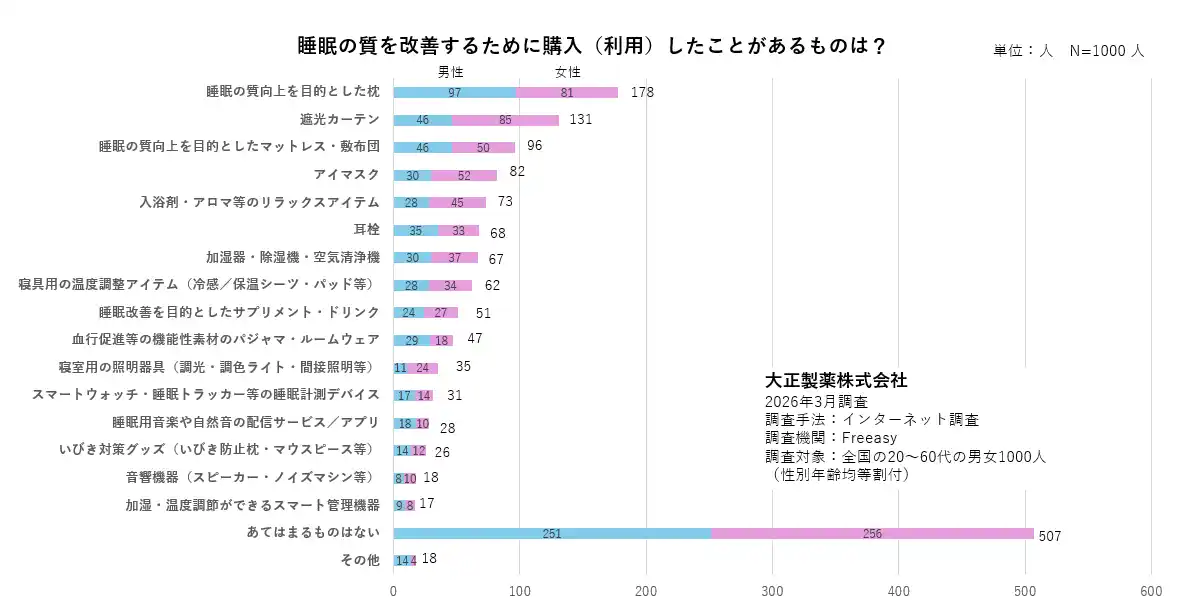 また、「睡眠の質を改善するために購入(利用)したことがあるもの」に関しては、1位が「睡眠の質向上を目的とした枕」(178人)、続いて「遮光カーテン」(131人)、「睡眠の質向上を目的としたマットレス・敷布団」(96人)、「アイマスク」(82人)、「入浴剤・アロマ等のリラックスアイテム」(73人)という結果です。 |