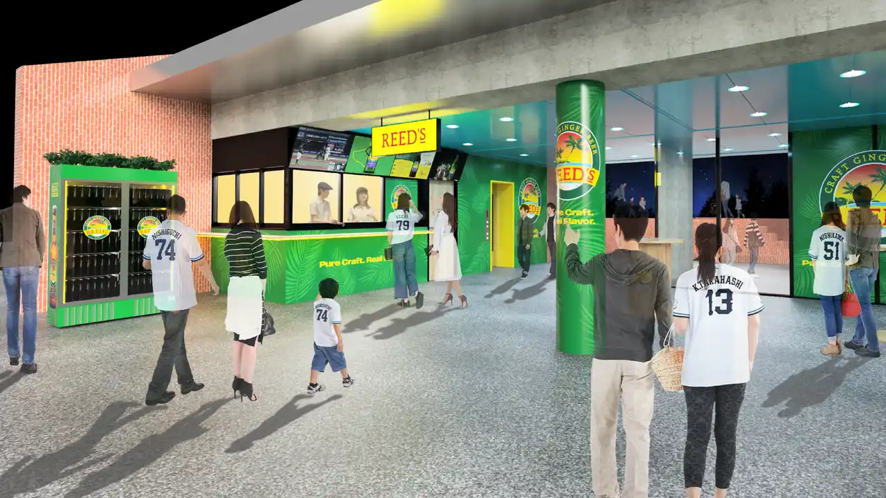 ベルーナドーム3塁側 2F にて、クラフトジンジャードリンクブランド REED’S(リーズ) を楽しめる |