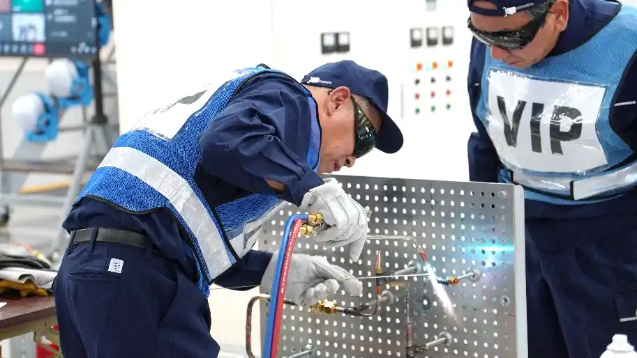 当日は各事業所から選抜された代表選手たちが1チーム2名体制で出場し、「電気回路」「ろう付け加工」「専門知識」の3種目で総合順位および種目別順位を競い合いました。具体的には、正確な配線と確実な作動を完了させる電気回路競技や、配管を製作し漏れがないことを確認するろう付け加工競技など、いずれも現場の実務に求められる高い水準を反映した実践的な内容です。これらの課題に対し、参加者たちは制限時間の設けられた緊張感の中、日頃の研鑽の成果を「正確性とスピード」そして「安全・品質」の両面から存分に発揮し、全力で挑みました。 |