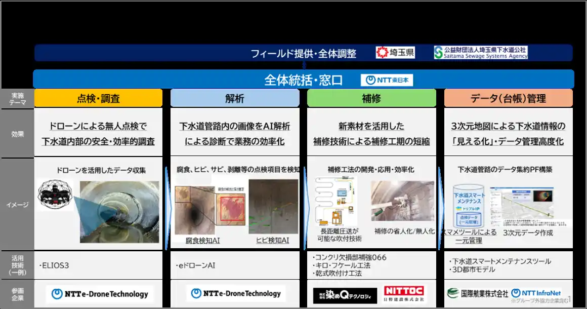 | 株式会社NTT e-Drone Technologyがドローンによる管路内の点検データ収集を担い、国際航業がAIを活用した劣化診断を行います。そのうえで、診断結果に基づく補修・施工を日特建設株式会社と染めQテクノロジィが担当いたします。管路延長が約2万kmに達する埼玉県を実証フィールドとし、各社の専門技術を組み合わせることで、点検から補修までを一気通貫で実行できる管路管理の仕組みを確立します。本研究体の取り組みにより、ドローン点検・AI診断・補修施工を組み合わせた一気通貫の管理手法が実証段階で有効性を示すことで、全国の自治体が導入を検討する際の技術的・制度的な指針となることが期待されます。 | |||
