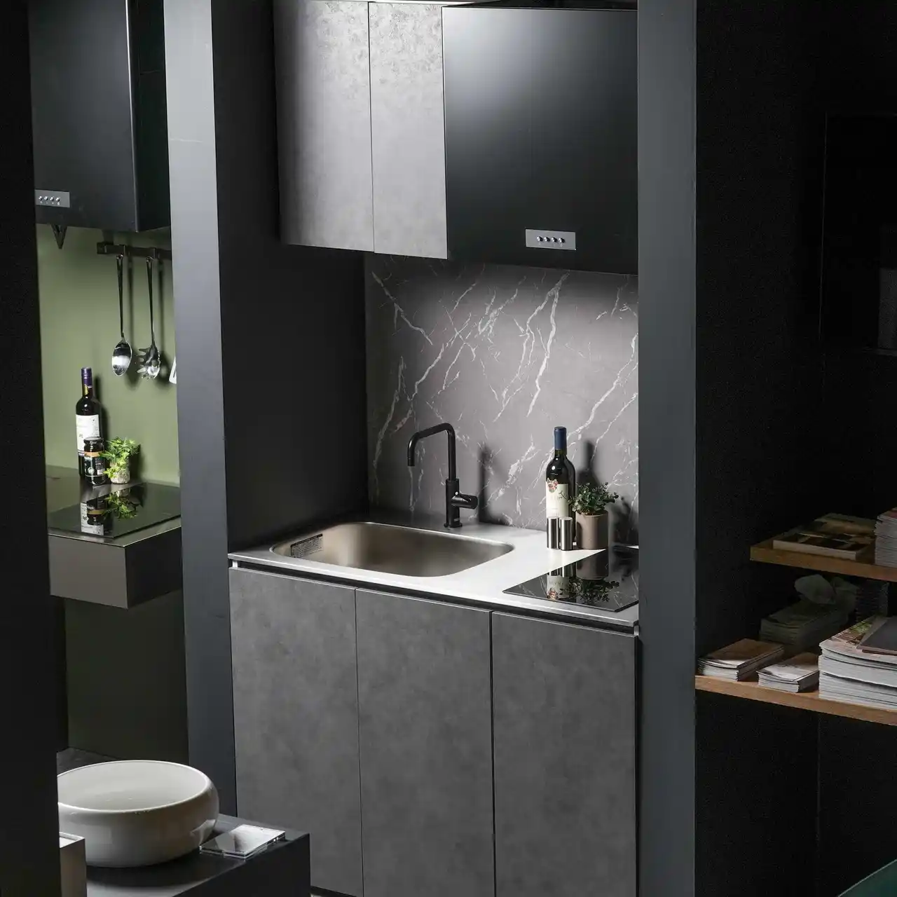 トレンドのモルタル調を取り入れた新作ミニキッチン『モルシーナ』も展示。奥行き450mmを選択でき、限られた空間をスタイリッシュに演出するミニマルなデザインが特徴です。 |