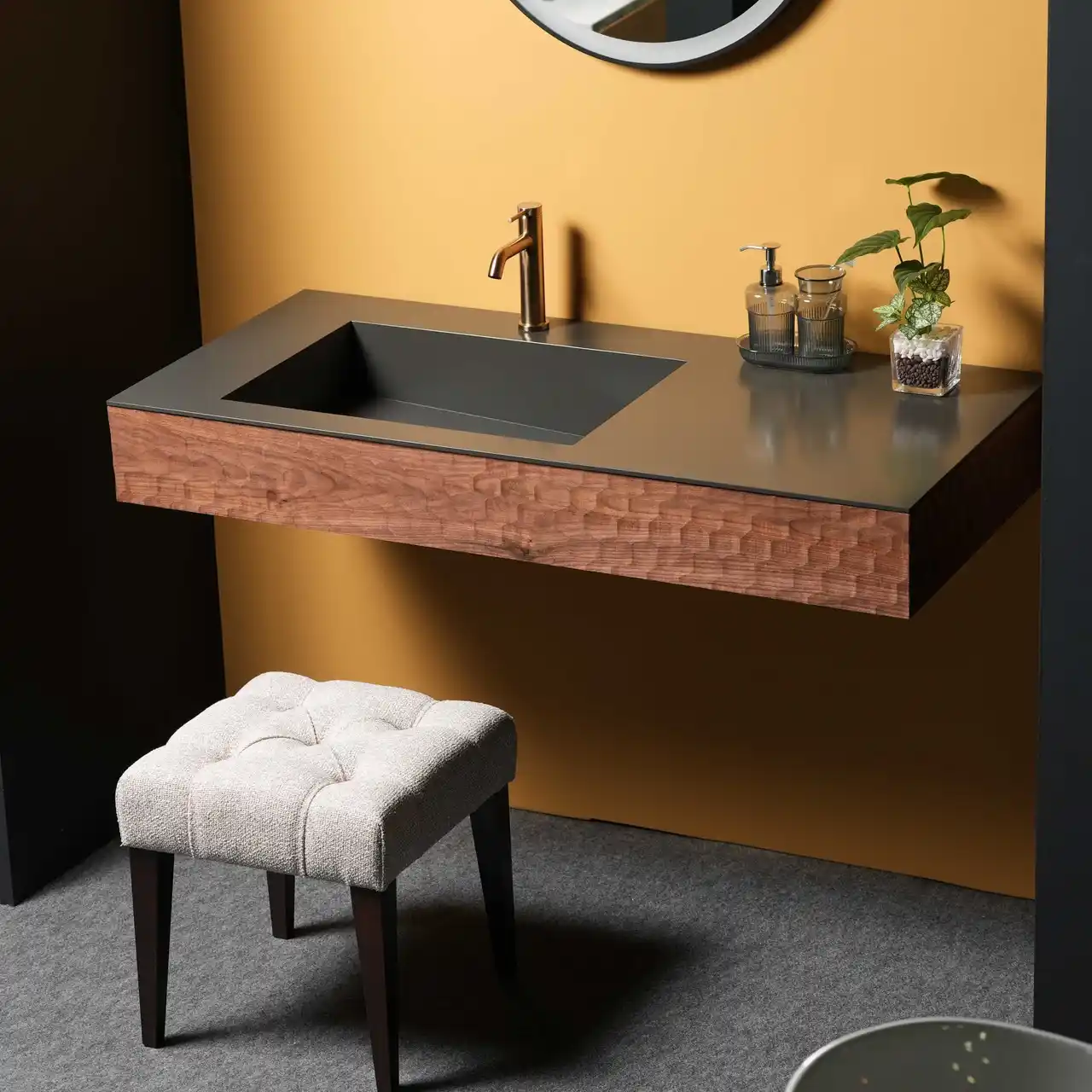 会場で初披露した『モルネオ』は、本物の左官仕上げならではのムラ感や雰囲気を、熟練の職人の手仕事で仕上げたメイドインジャパン品質の洗面台です。イタリア製の左官材「オルトレマテリア」を採用し、高機能かつ高い意匠性を実現した、一体感のある洗面提案が注目を集めました。 |