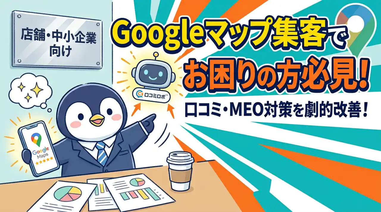 | 口コミロボ(TM)は、Googleマップを活用した集客や、Googleビジネスプロフィール運用に関する課題を抱える店舗オーナー、飲食店、美容室、クリニック、地域企業、中小企業などを主な対象としています。 | |||
