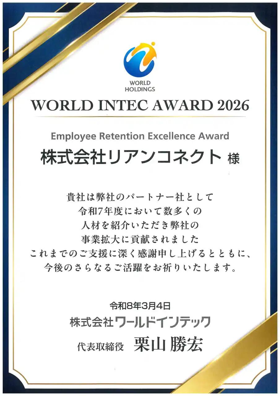 この度、株式会社ワールドインテック様より「2025年度 従業員定着優秀賞」をいただき、大変光栄に思います。 |