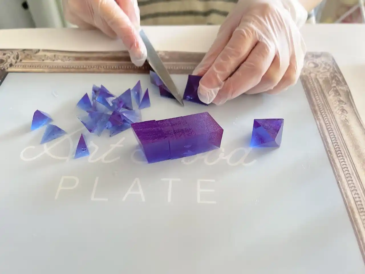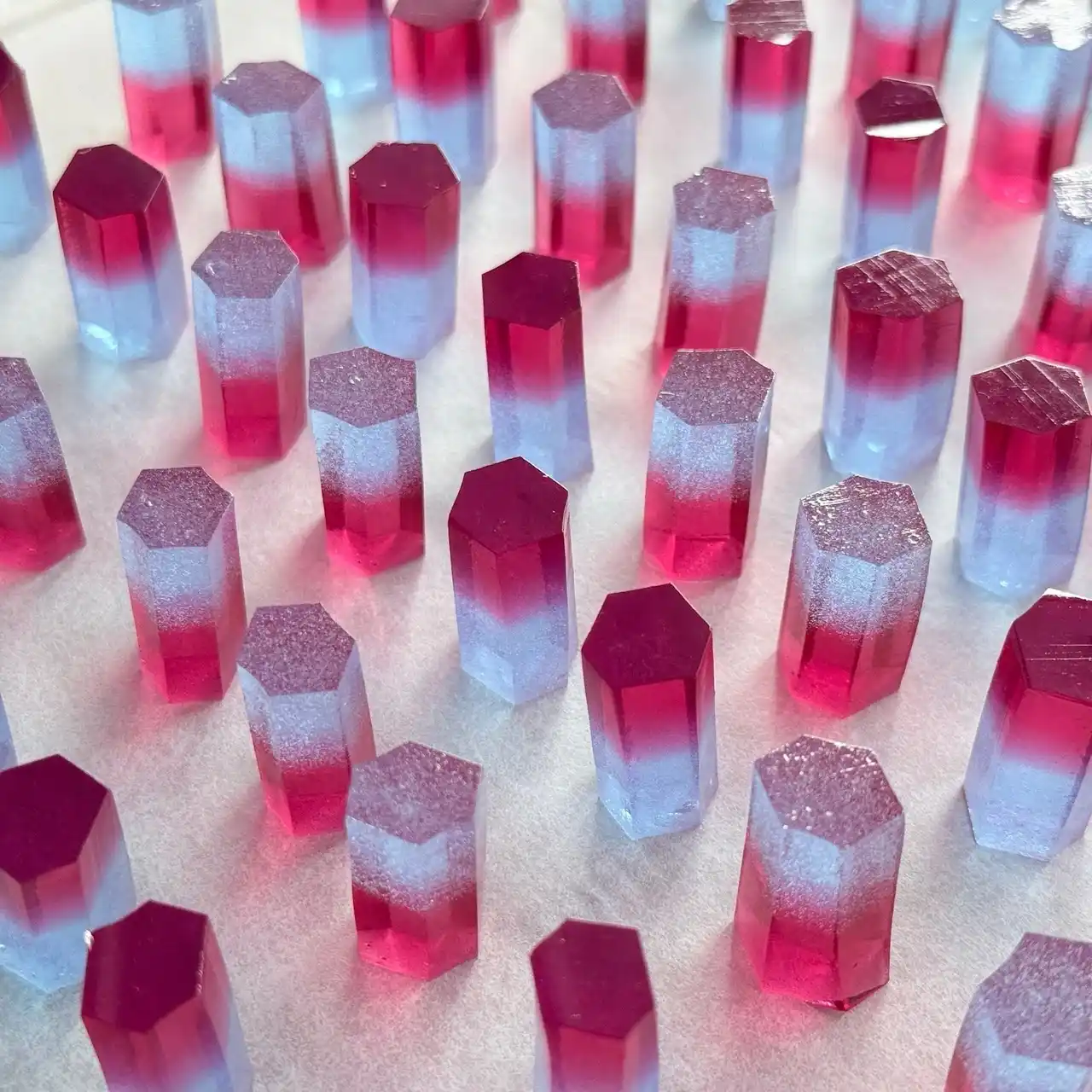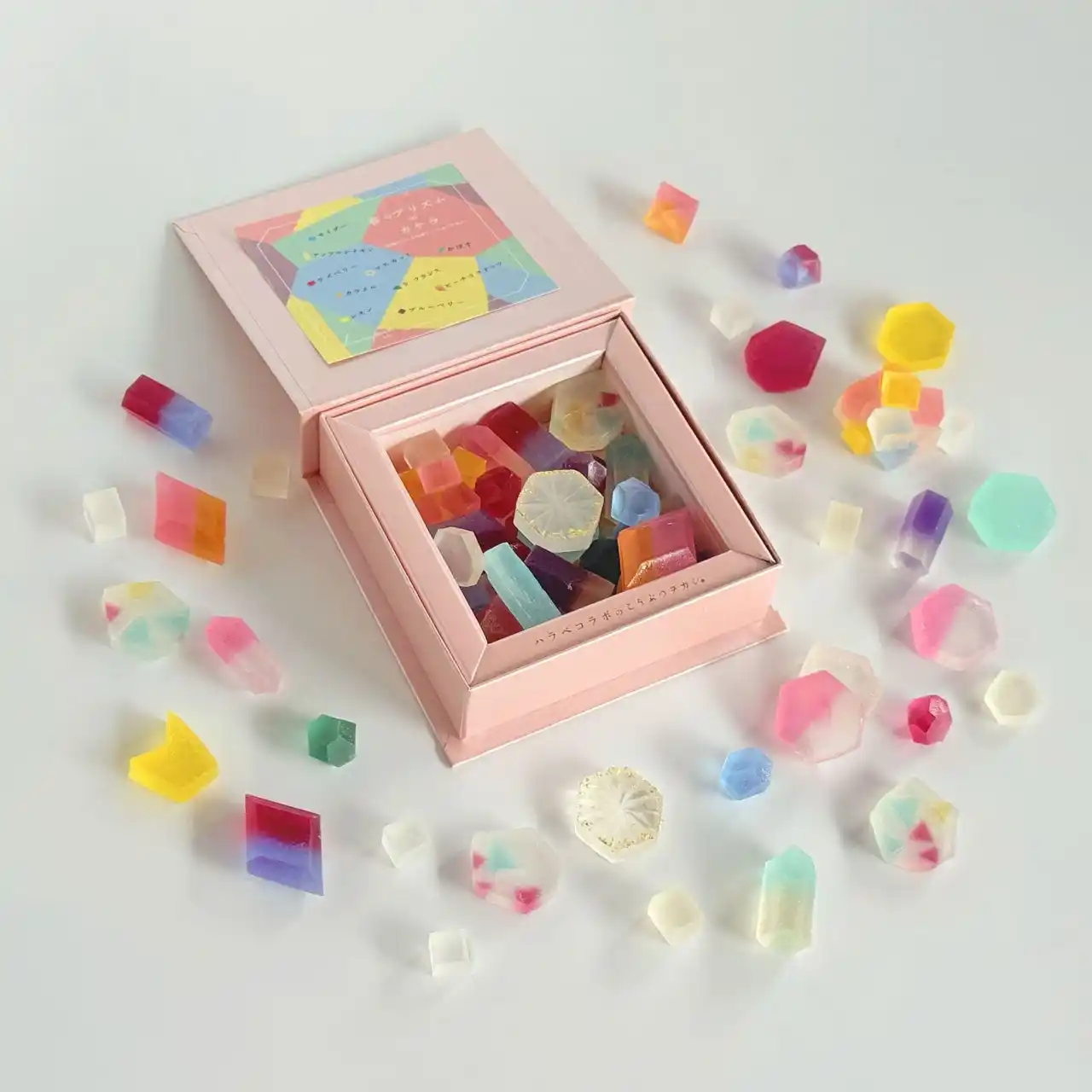 プリズムの光をイメージしたグラデーションの琥珀糖が沢山入っている |