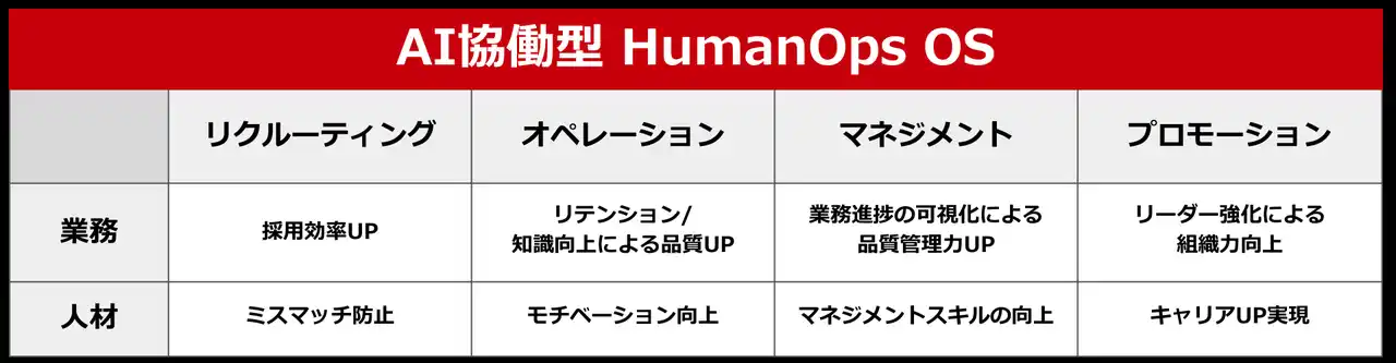 「AI協働型 HumanOps OS」を活用し、活躍人材の特性把握に基づく採用精度の向上と採用プロセスの効率化を実現するとともに、ロールモデル分析に基づく成長支援やキャリア形成支援、適性に応じた業務配置を推進いたします。これにより、従業員満足度の向上と定着率の改善を図り、人的資本の最大化を通じて企業価値の向上と持続的な事業成長の実現に貢献してまいります。 |