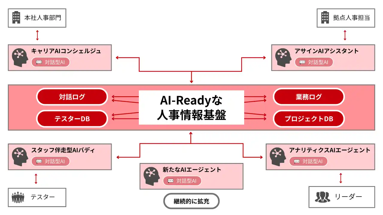 「AI協働型 HumanOps OS」は、人事・業務データの統合基盤(OS)とその上で協働する対話型AIエージェントを中核とし、テスターの業務支援、業務課題の解決、スキル評価、キャリア開発を統合的に支援するとともに、業務の品質管理、進捗状況の可視化、KPI分析、ガバナンス強化など、業務運営に必要な管理機能を提供するプラットフォームです。 |