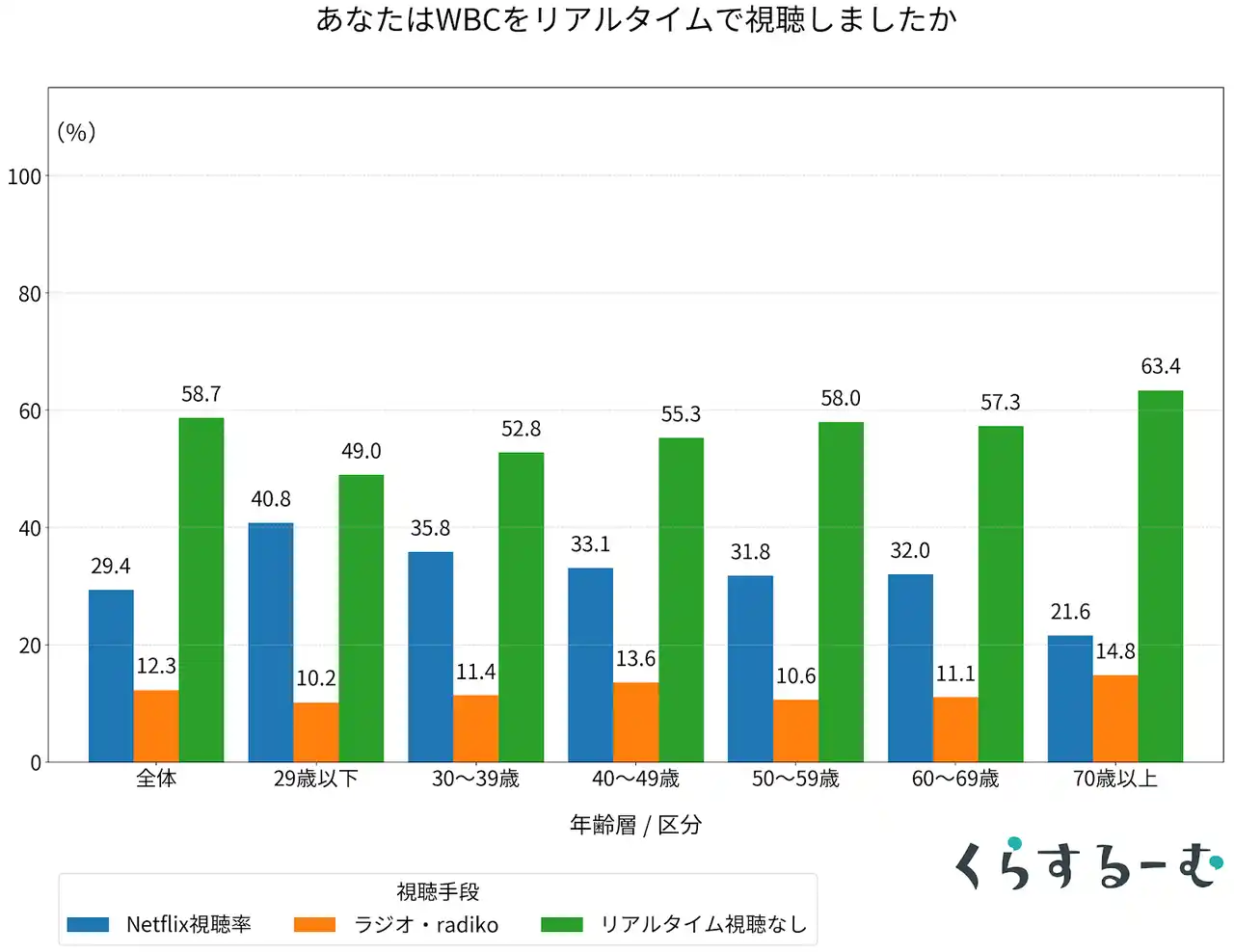視聴手段を世代別に見ると、非常に興味深い傾向が見られました。Netflixの利用が難しい層、あるいはテレビ放送がないことを受けた代替手段として、70代以上の層では「ラジオ・radiko」による音声での実況聴取が14.8%に達しました。これは同世代のNetflix視聴率(21.6%)に肉薄する数字であり、デジタル配信が主流となる中で、古くからの野球観戦スタイルである「ラジオ」が重要な役割を果たしています。 |