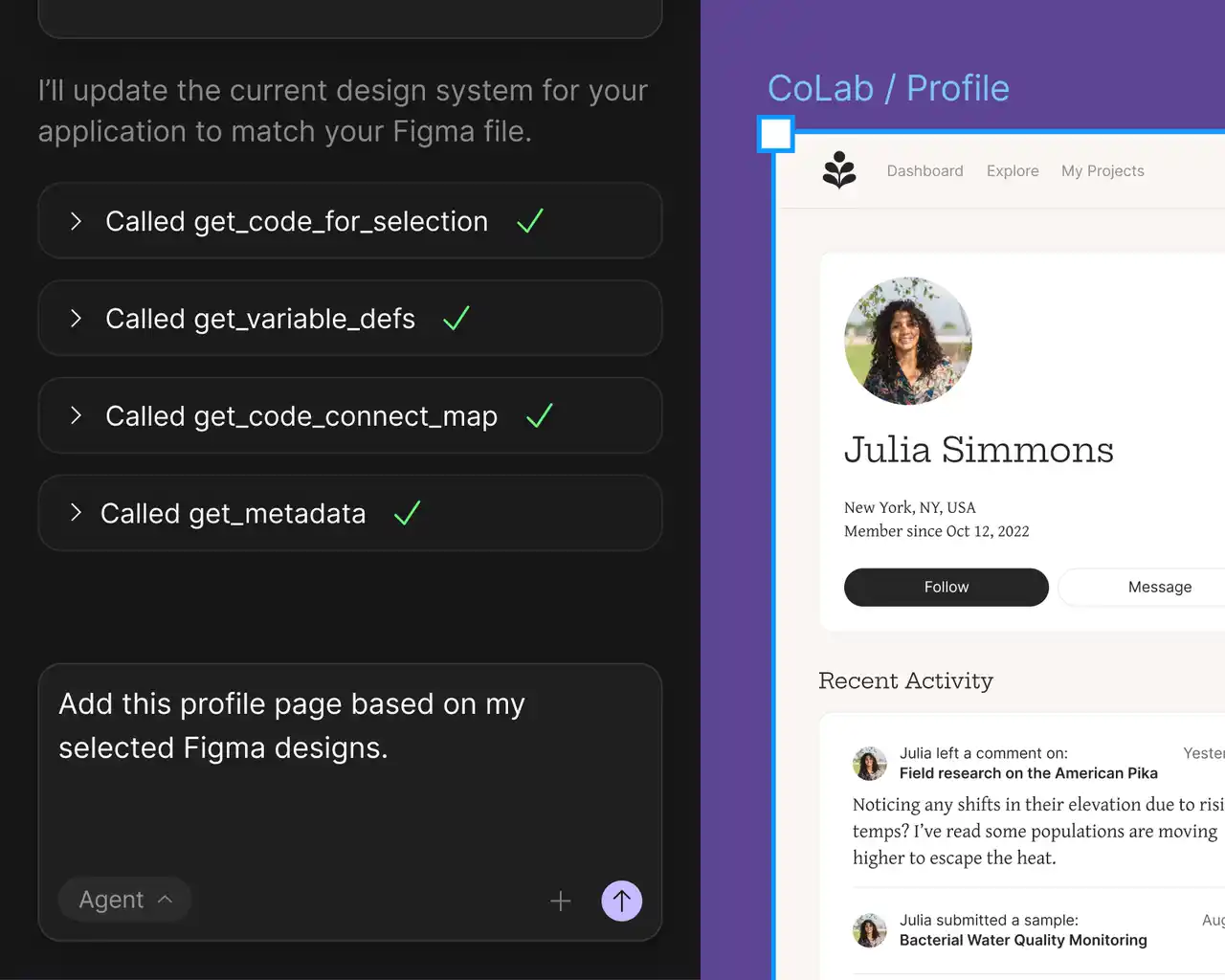Figma MCPサーバーは、チームがどこからでも開発を始められるワークフローを実現します。コードを活用してアイデアを素早く構築・検証し、Figmaの無限のデザインキャンバスを使ってチーム全体で探索・反復・ブラッシュアップすることができます。その結果、デザインとコードの間で双方向の「ラウンドトリップ(反復開発)」ループを生み出します。 |