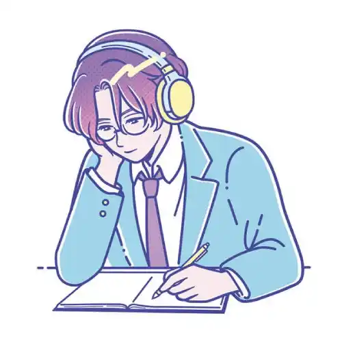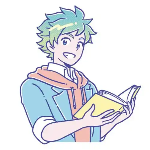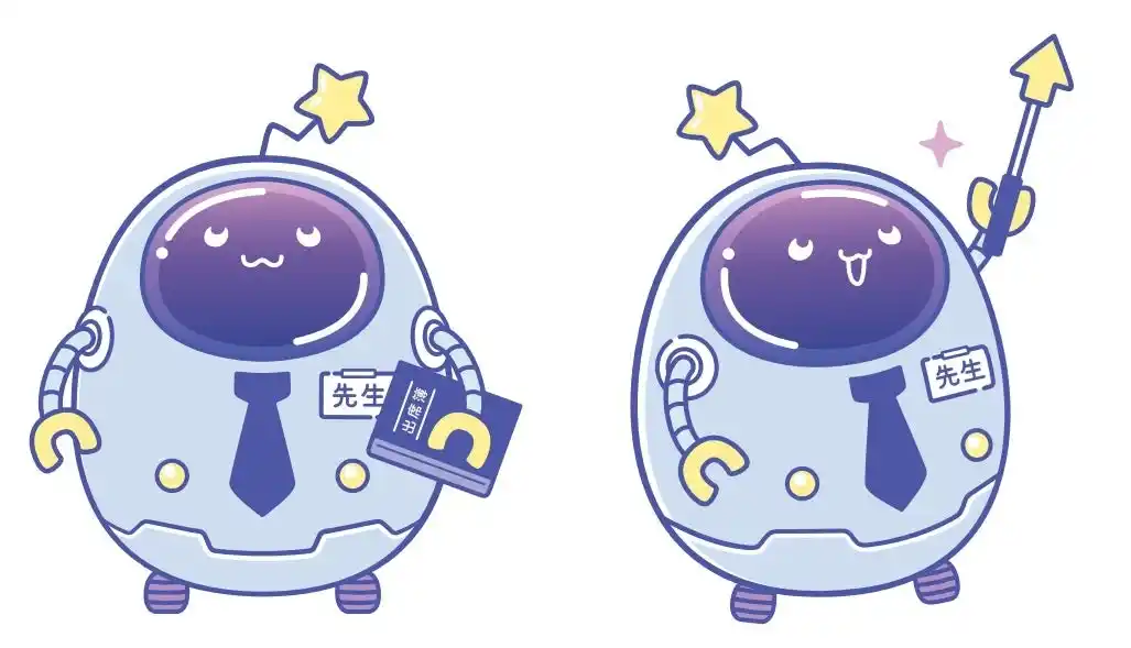 ネクタイを締め、手には参考書を持つチャーミングな姿で、最新の学びをナビゲートします。 |