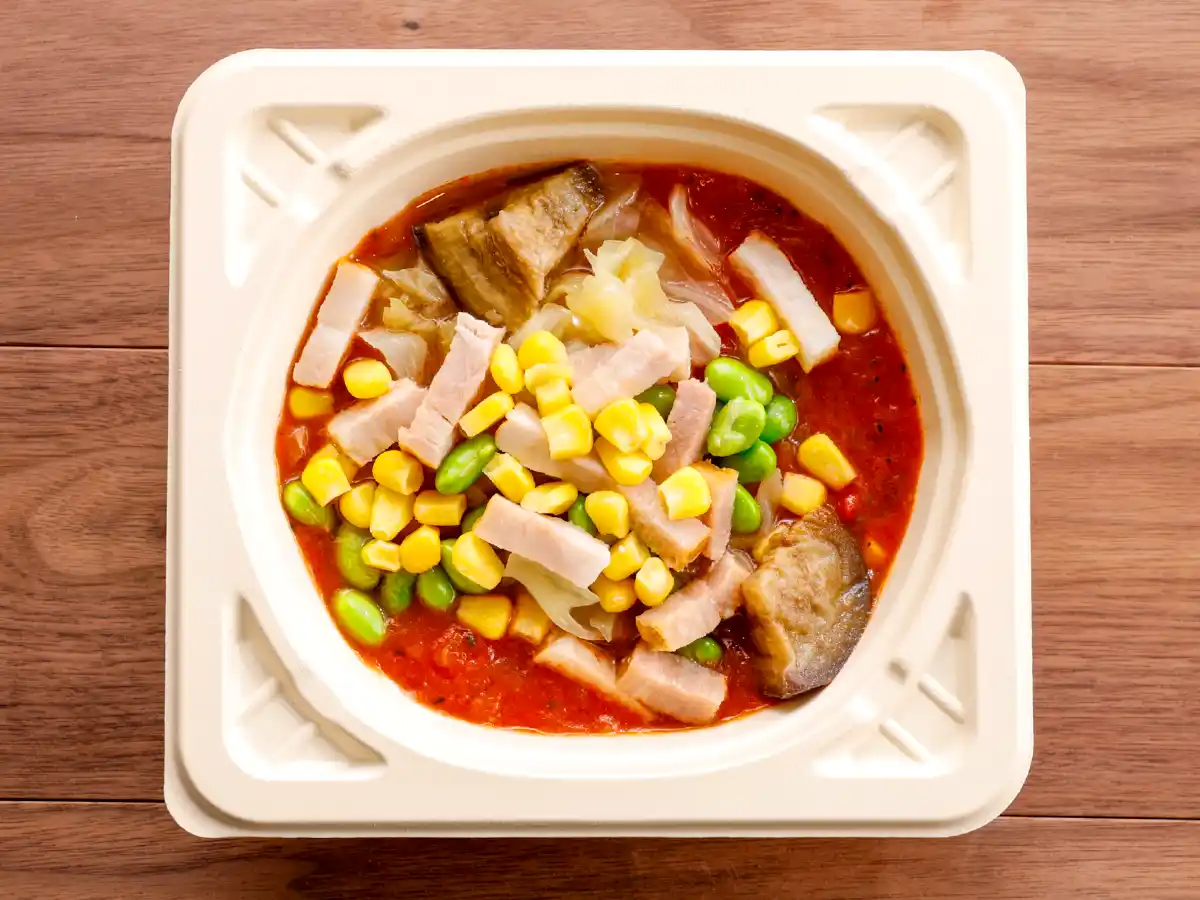 トマトの濃厚な旨みをベースに、隠し味にコンソメとベーコンを加え、酸味の角を取ってまろやかに仕上げました。レンジで温めた瞬間に広がるバジルの爽やかな香りは格別です。茄子や枝豆、ベーコンなど食感の異なる7種の具材をたっぷり詰め込み、最後の一滴まで飽きることなく楽しめる一杯です。 |