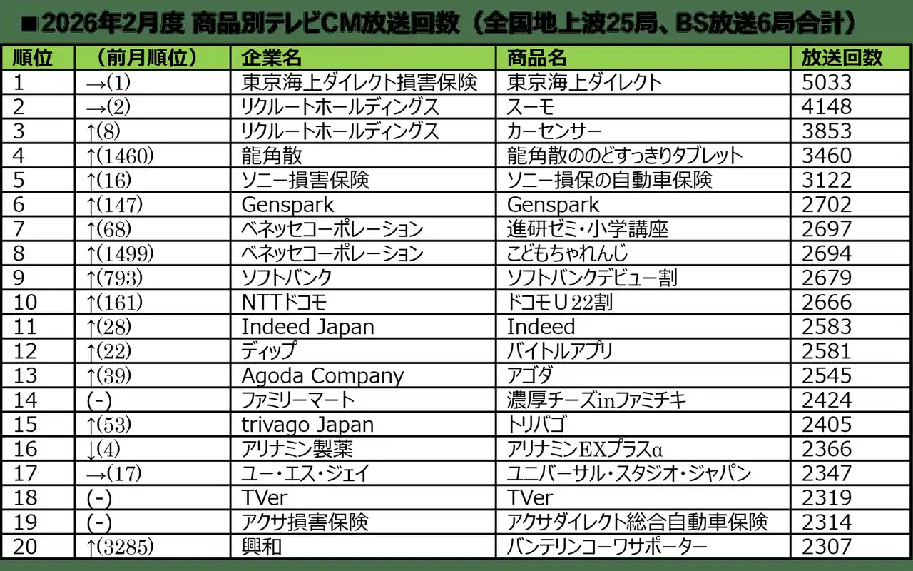 ■2026年2月度 商品別テレビCM放送回数ランキング |