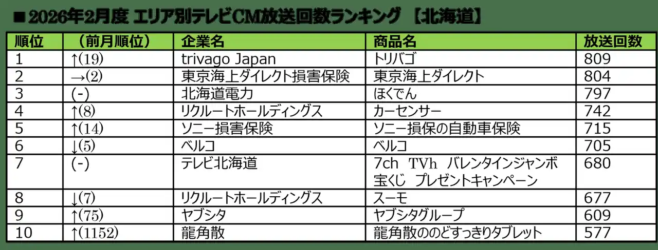 このたび、テレビCMメタデータシステムを活用し、2026年2月度の主要5大都市圏※(地上波25局、BS放送6局)で放送されたテレビCMの放送回数を調査・集計結果を下記の通りお知らせします。 |