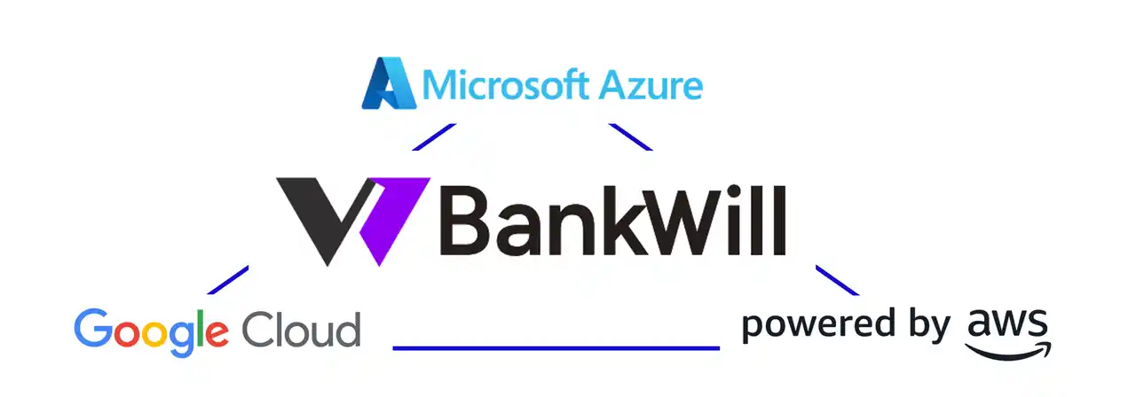 「BankWill」は、システム基盤の飛躍的な可用性向上を目指し、日本初のマルチクラウド構成としてMicrosoft AzureとGoogle Cloudの2つのクラウド環境での稼働を予定しておりましたところ、このたび新たに、アマゾン ウェブ サービス(AWS)を稼働環境の選択肢として追加することを決定しました。 |