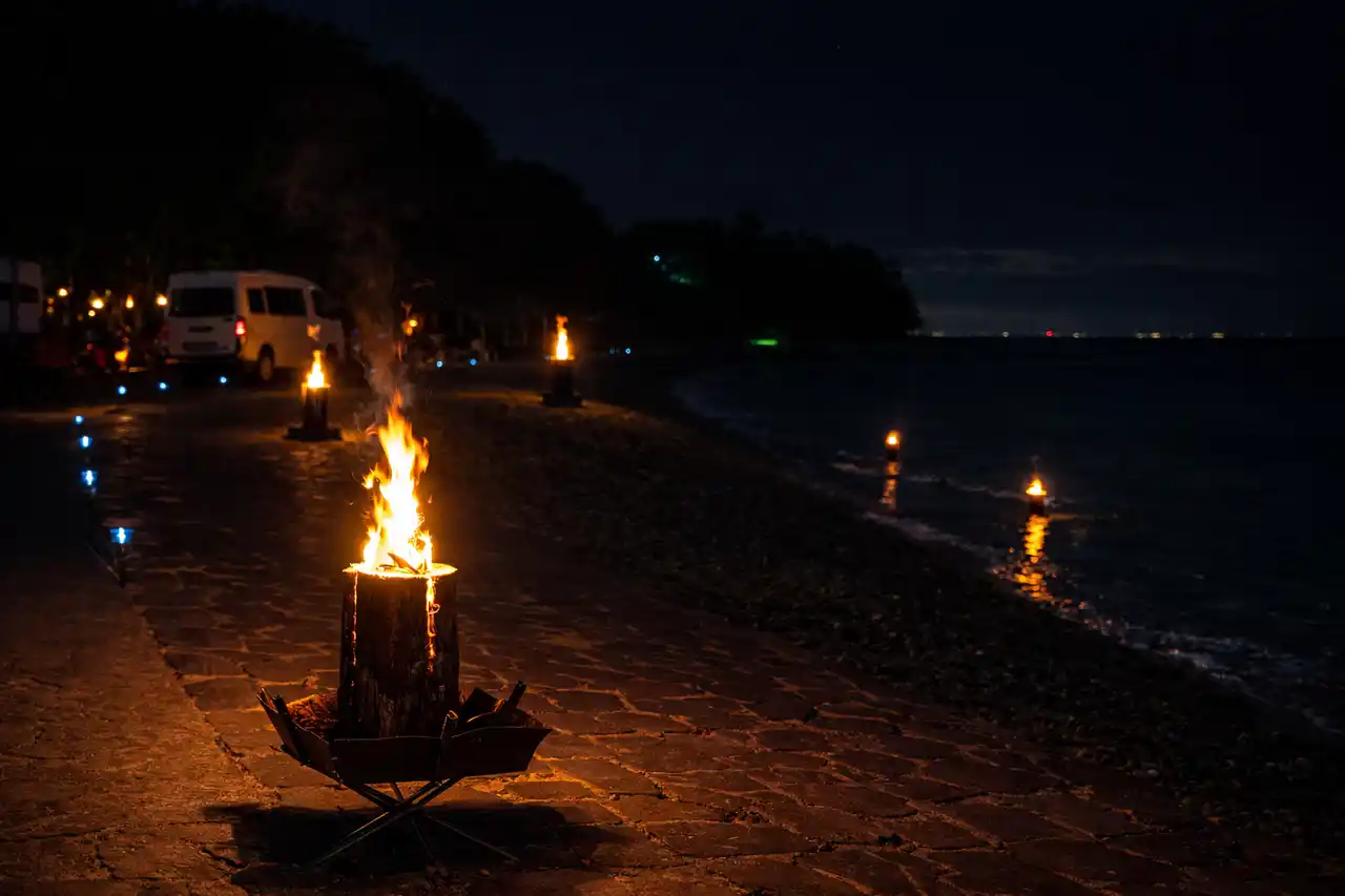 ライトアップの光とは一味違う、自然の火が織りなす「ゆらぎ」を感じながら、夜の海辺を散策する贅沢な時間を提供します。 |