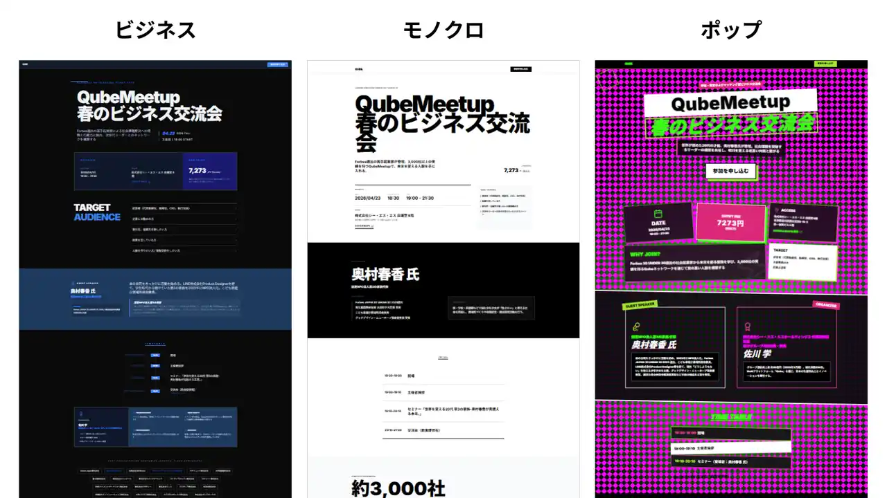 Qubeに登録されたイベントを選択し、「ビジネス」「ラグジュアリー」「ポップ」などのテーマを選ぶだけ。 (※テーマは「ビジネス」「フューチャー」「ラグジュアリー」「ポップ」「モノクロ」「レトロゲーム」の全6種類) AIが選ばれたテーマに合わせて専用LPを自動生成します。 |