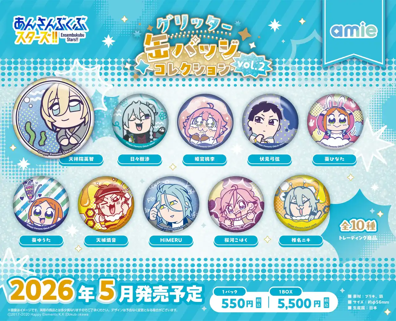フィギュア&ホビー通販大手の「あみあみ」を運営する大網株式会社(本社・東京都文京区)は、自社が展開するグッズブランド「amie(アミィ)」から『あんさんぶくぶスターズ!!』の「グリッター缶バッジコレクション vol.1~5」を、現在ご案内中です。