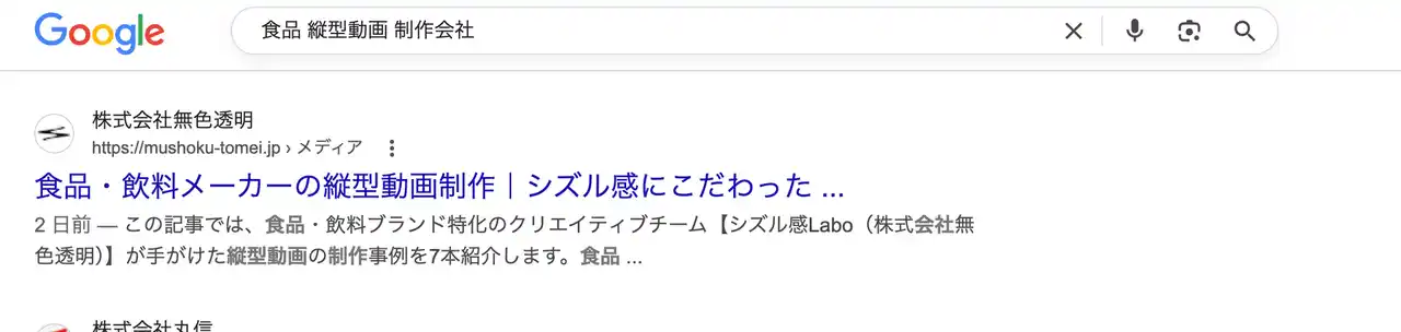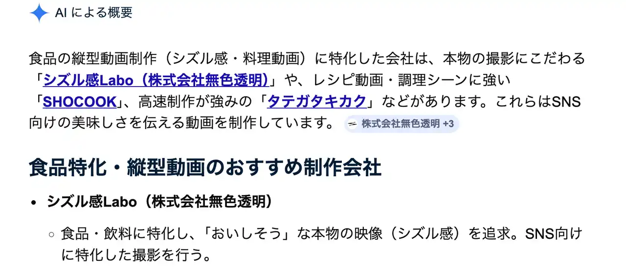 | 株式会社無色透明(所在地:京都市、代表取締役:藤田竣也)が運営する食品・飲料特化のクリエイティブチーム「シズル感Labo」は、「食品 縦型動画 制作会社」「食品 縦型動画」などの検索キーワードにおいて、Google AI Overview(AI生成の検索結果要約)で1位引用を獲得したことをお知らせします。 | |||