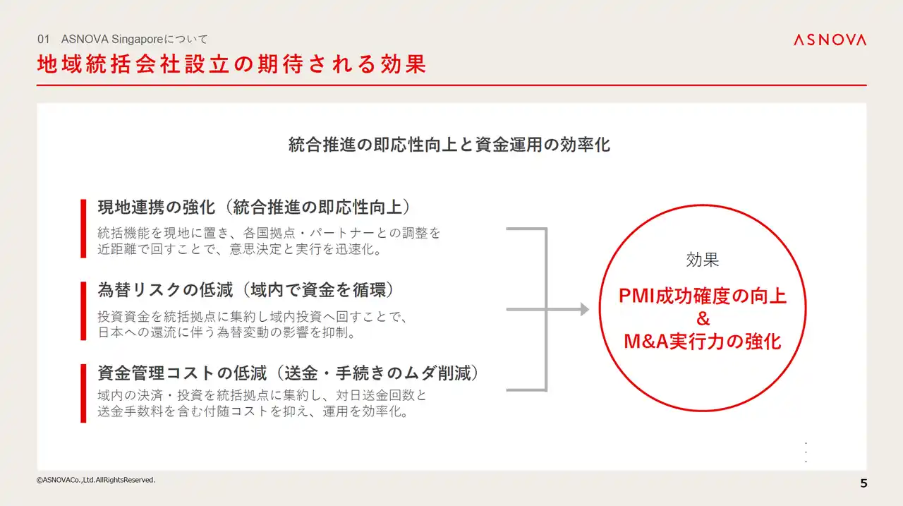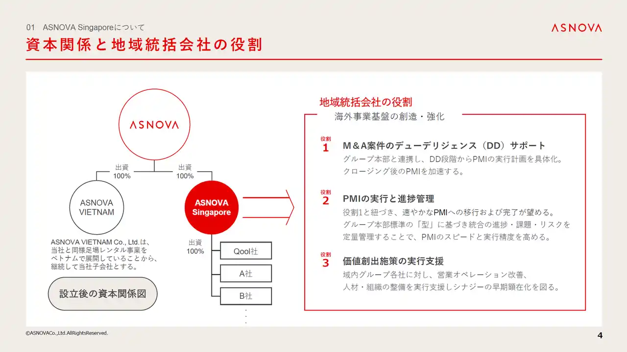 ASNOVA Singaporeは100%出資子会社となる予定です。地域統括会社の役割は大きく3つ。 |