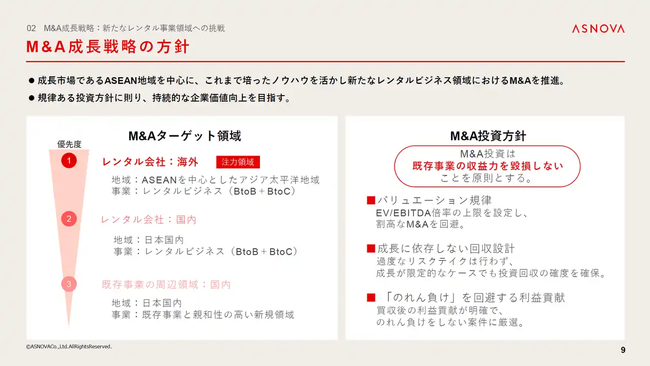 今後は、ASNOVA強みを活かしながら、レンタルビジネス領域におけるM&Aを主として積極的に挑戦してまいります。また、BtoCの領域も視野にいれながら扱う商材や地域も大きく広げていき、規律ある投資方針に則り、持続的な企業の向上を目指します。 |