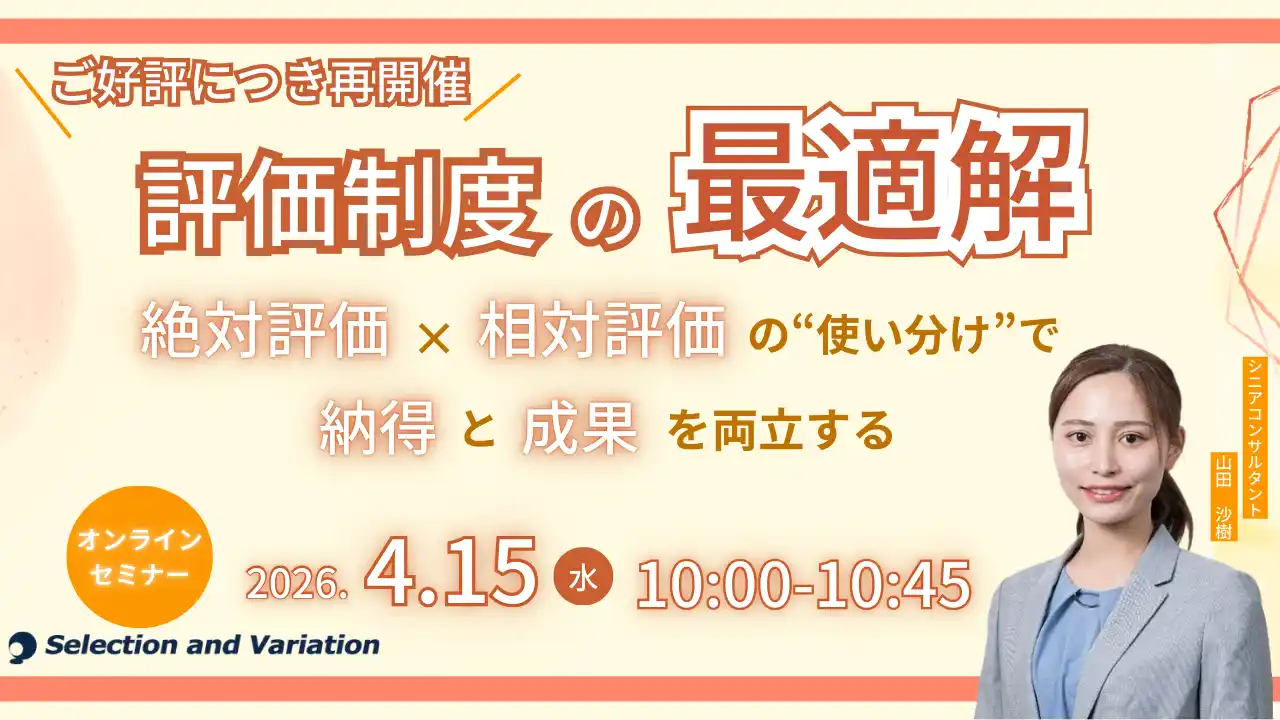 | 組織・人事コンサルティングファームであるセレクションアンドバリエーション株式会社(以下、当社、東京都千代田区丸の内、大阪市西区、名古屋市西区 / 代表取締役社長:平康慶浩/ URL:https://sele-vari.co.jp/ )は『評価制度の最適解 ― 絶対評価×相対評価の“使い分け”で、納得と成果を両立する ―』セミナーを2026年4月15日(水)10:00~10:45に開催することをお知らせいたします。 | |||||||||