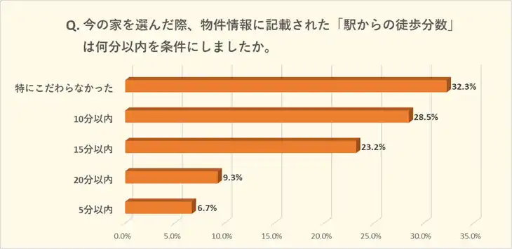 「特にこだわらなかった」32.3%が最も多く、最寄り駅への依存度は大きくないことが分かりました。利便性が高い「5分以内」を条件とする人は僅か6.7%に留まり、多くの方が10~15分以内をひとつの目安としています。 |