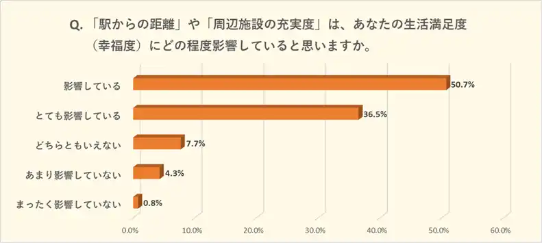 合計87.2%が立地利便性と幸福度の相関を肯定しています。効率的な生活環境の確保が、単なる「便利さ」を超えて心のゆとり(QOL)に直結していることが裏付けられました。 |