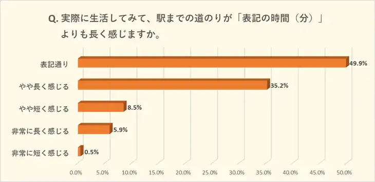 <Q2. 実際に生活してみて、駅までの道のりが「表記の時間(分)」よりも長く感じますか。> |