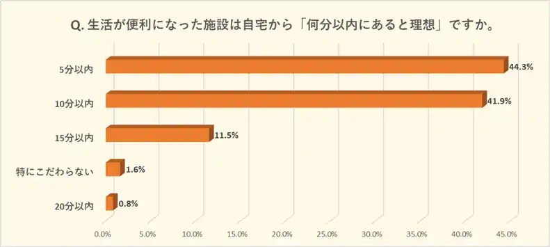 生活利便が高い施設は自宅から「5分以内」に欲しいとの回答が最多