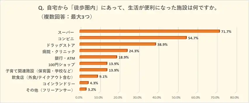 3)暮らしを豊かにする近隣施設トップ3は、食と消耗品を調達する施設である「スーパー」「コンビニ」「ドラッグストア」。 |