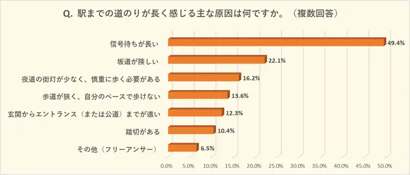 2)合計41.1%が物件情報の「駅徒歩分数」より実際は長く感じると回答。主な原因は「信号待ち(49.4%)」。 |