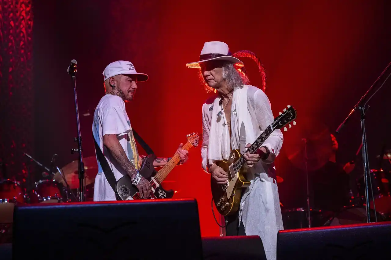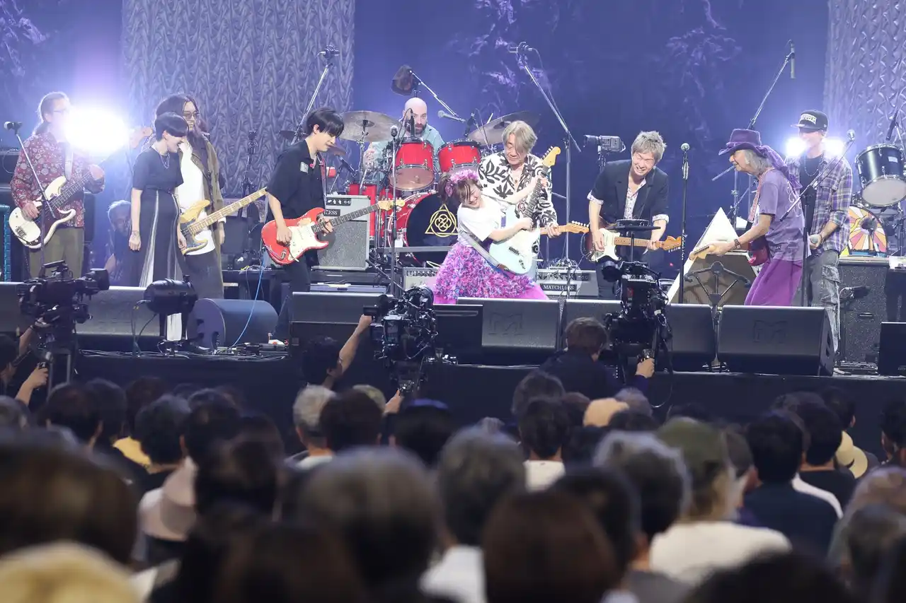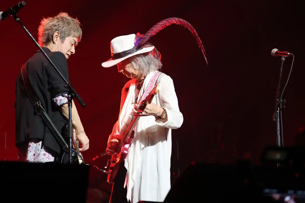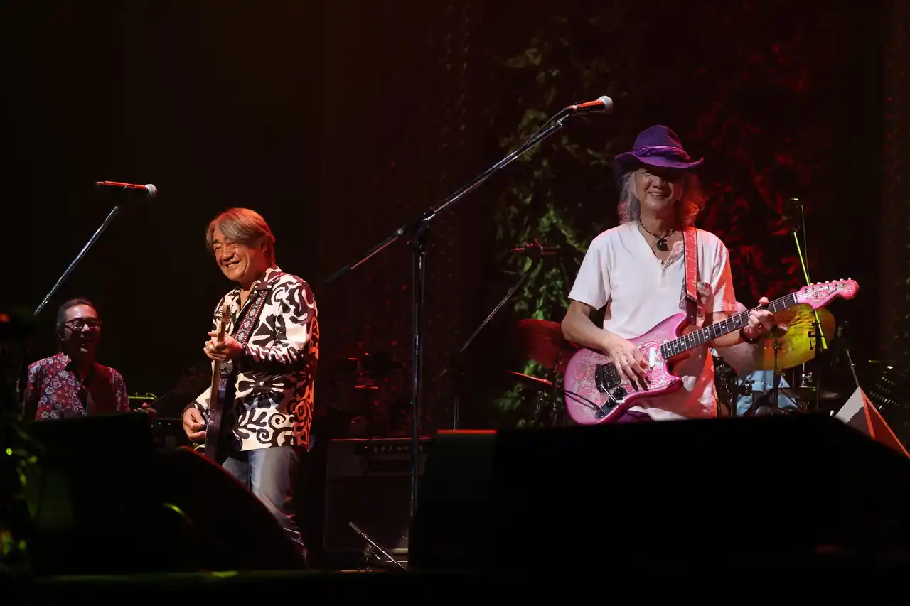 国内屈指の名手たちがステージに華を添える共演も必見で、金子マリ/鳴瀬喜博/佐藤準/古田たかしによるスモーキー・メディスンを皮切りに、はたけ(シャ乱Q)や春畑道哉(TUBE)を迎え入れて存分にギターを歌わせた魅惑のインストゥルメンタル・ナンバー、佐藤タイジ/西慎嗣/奥田民生とともに忌野清志郎と共作した「かくれんぼ」を見事なコーラスワークで歌いあげたアコースティック・セッション、愛息JESSEとともにラウドな轟音を響かせた「ONE MORE