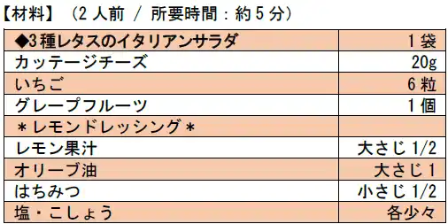 3.お皿に「3種レタスのイタリアンサラダ」を盛りつけ、その上に1.をトッピングする。カッテージチーズを散らし、2.のドレッシングを回しかけて完成 |