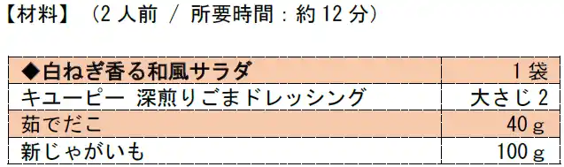 2.1.のじゃがいもに「深煎りごまドレッシング」を入れて混ぜる。粗熱が取れたら「白ねぎ香る和風サラダ」、茹でだこを加えて軽く混ぜる。お皿に盛りつけて完成! |