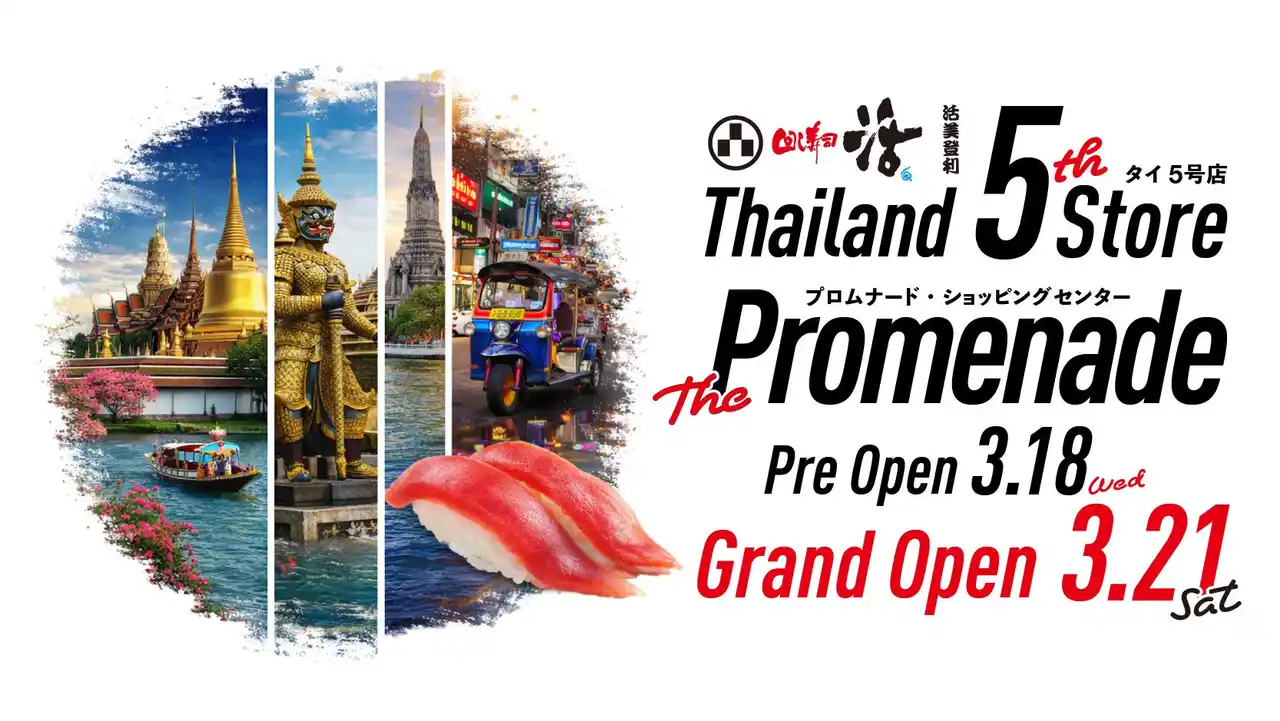 タイ王国内5号店となる、「回し寿司 活 プロムナード店」が3月にオープンいたします! ソフトオープン :2026年 3月18日(水) グランドオープン:2026年 3月21日(土) |
