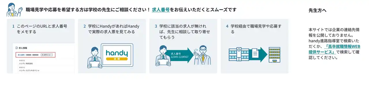 当社はこれからも、『高卒求人ナビ』『Handy進路指導室』を通じて、高校生一人ひとりが納得して社会への第一歩を踏み出せる環境づくりに尽力してまいります。テクノロジーの力で、学校の先生と共に、高校生のキャリア選択をより自由で自分らしい未来を自ら選び取れるよう、サポートして参ります。 |