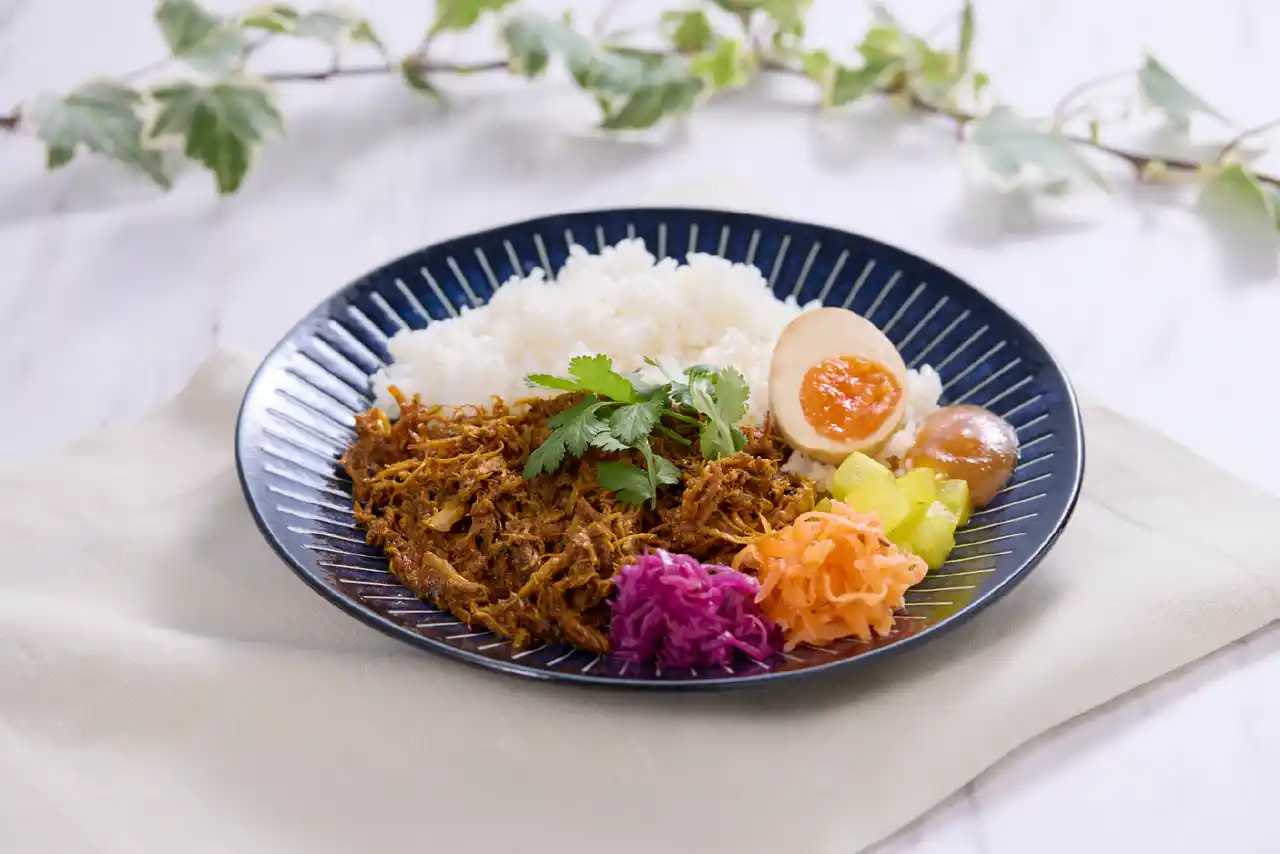 ロスパンで育った鶏とその卵、規格外の柿、コーヒーかすなど、本来は廃棄される可能性のある素材を組み合わせたパキスタンカレーです。単体では使いづらい食材も、スパイスを効かせたカレーに落とし込むことで、それぞれの個性を無理なく引き出し、奥行きのある味わいに仕上げました。親鶏の旨味、果実のやさしい甘み、コーヒー由来のコクと酸味が重なり食べ応えがありながらも、後味は軽やかな一皿です。 |