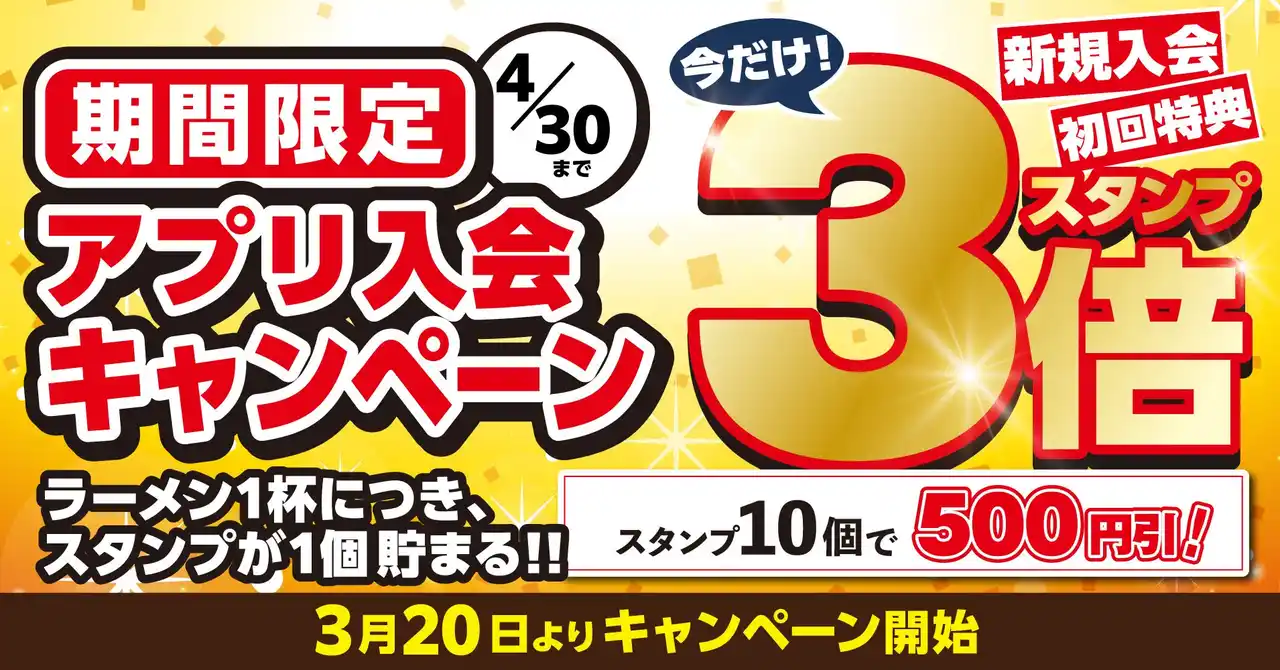 | 新規入会したお客様の初回特典として、スタンプが3倍になるアプリ入会キャンペーンを期間限定で開催いたします。通常、ラーメン1杯につきスタンプ1個付与されるところ、期間中に初めてご飲食いただいたお客様には、ラーメン1杯につきスタンプが3個付与されます。スタンプが10個貯まると、次回使える500円引きのアプリクーポンが届きます。ぜひこの機会をお見逃しなく! | |||
