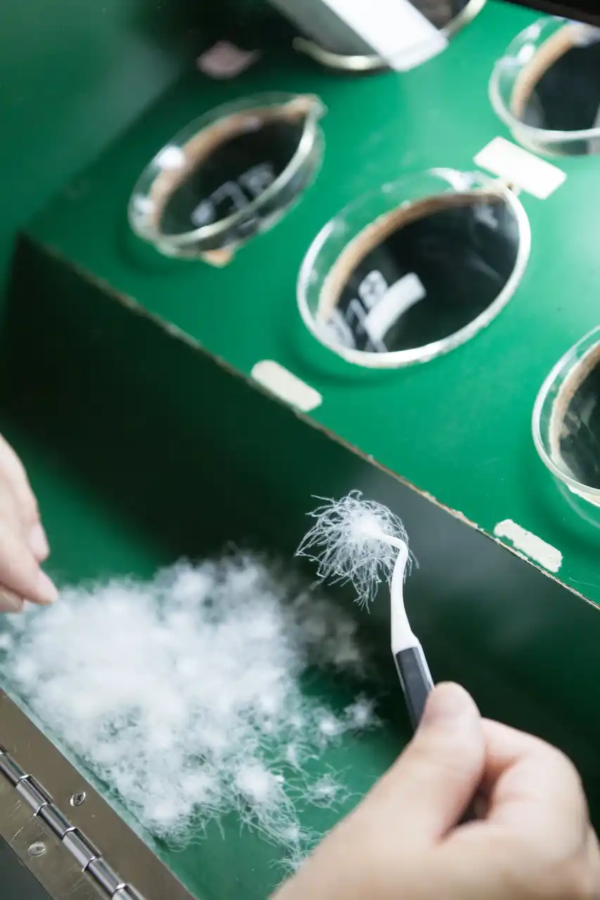 河田フェザーは、明治24年創業。長年にわたり高品質な羽毛の提供を追求し、原料調達から精製加工までを一貫して自社で管理しています。多気郡明和町のきめ細やかな地下水を使用し、不純物や劣化部分を丁寧に取り除くことで、新毛以上の清浄度を持つリサイクル羽毛へと再生させています。 |