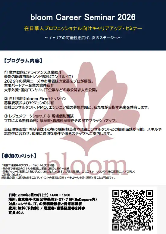 bloom株式会社(以下「bloom」)は、2026年3月28日(土)に「bloom Career Seminar 2026 ── 在日華人プロフェッショナル向けキャリアアップ・セミナー」を九段下・神保町にあるシェアオフィスのBuD square(バドスクエア)にて開催いたします。 |