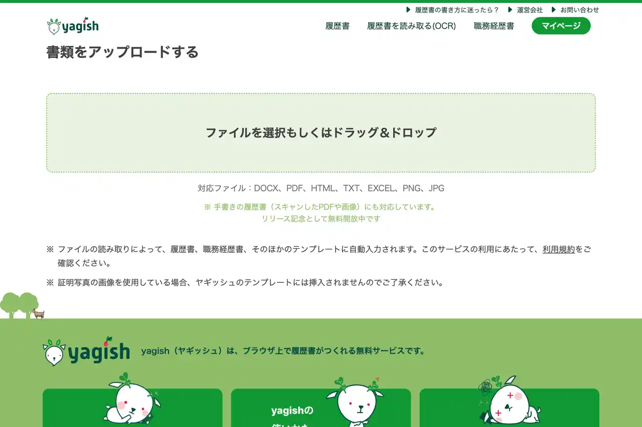 日本最大級のオンライン履歴書作成サービス「yagish(ヤギッシュ)」を運営する株式会社Yagish(本社:東京都渋谷区、代表取締役:金 相集)は、手元にある履歴書をスマートフォンで撮影、またはファイルをアップロードすることで、入力項目を自動補完する新機能「AI履歴書読み取り(OCR)」をリリースいたしました。 |