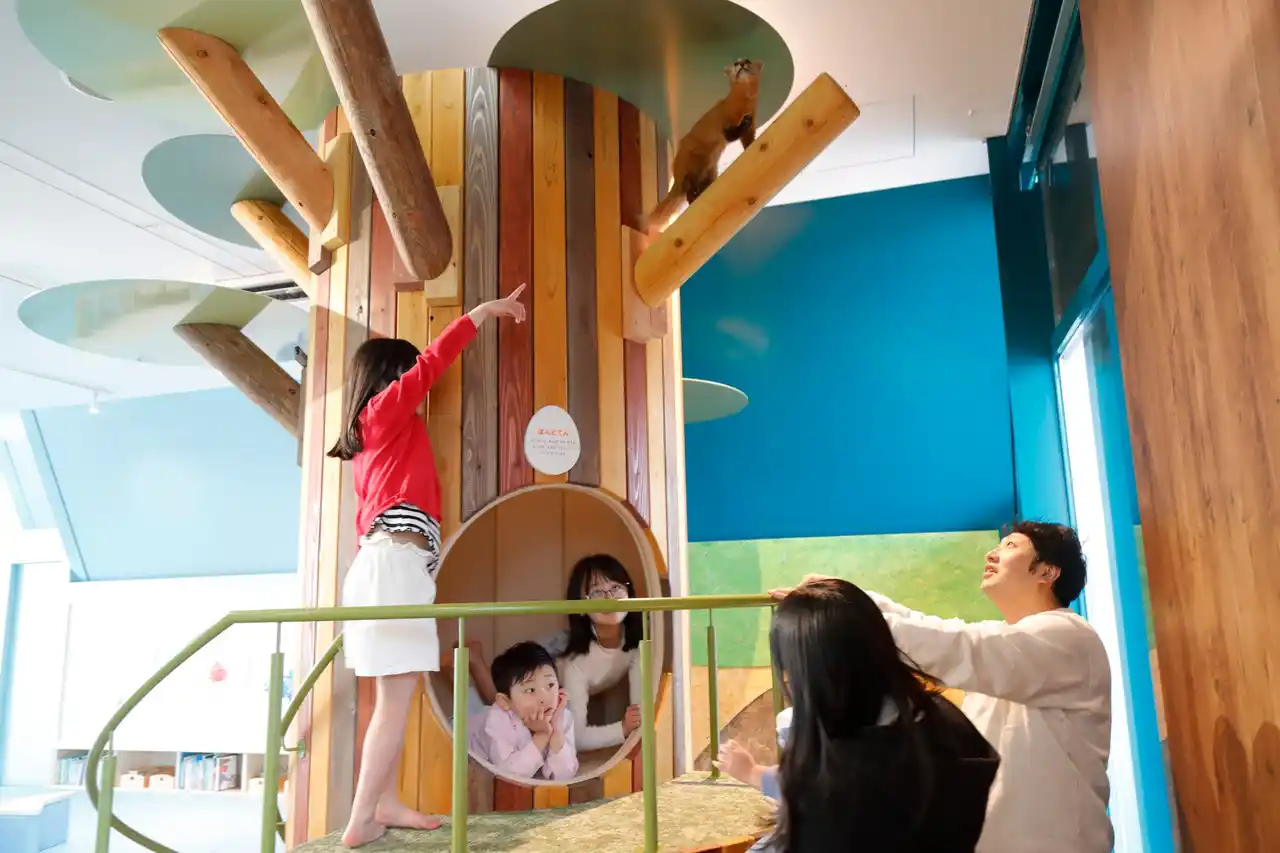 アクアマリンえっぐのとなりです。リスやモモンガといった日本の森に暮らす動物の展示とともに、動物の能力にチャレンジできる遊具がある屋外エリアです。遊びを通して動物たちが森で暮らすためにいかに高い能力を持っているかを体感しながら学ぶことができます。 |