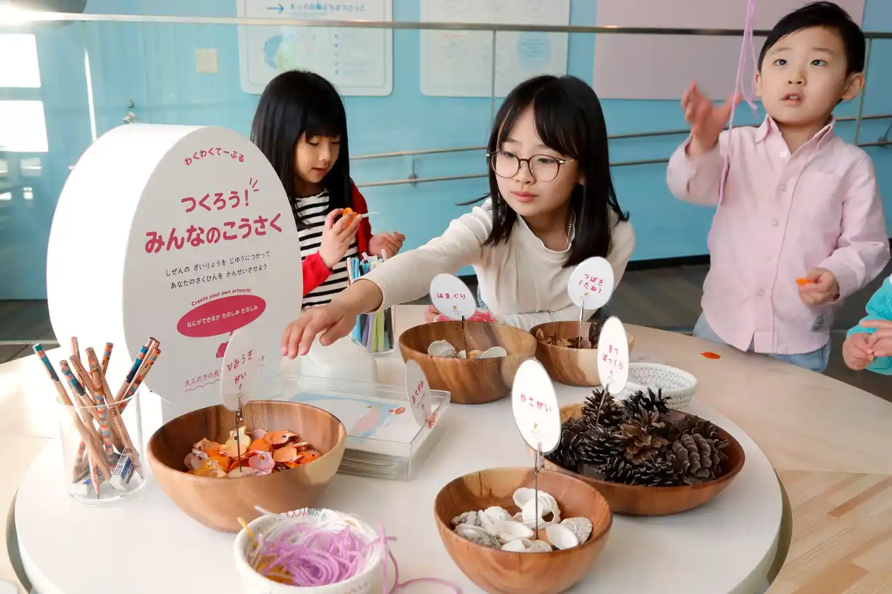アクアマリンえっぐのテーマに合わせた工作スペース。貝がら、木の実などさまざまな自然素材に触れながら、自由な発想を育むゾーンです。自分のオリジナル作品を作って楽しめます。作品はお持ち帰りいただけます。 |