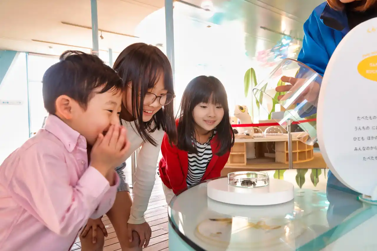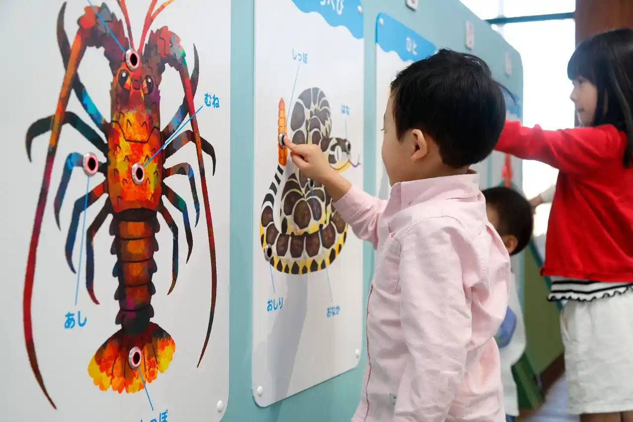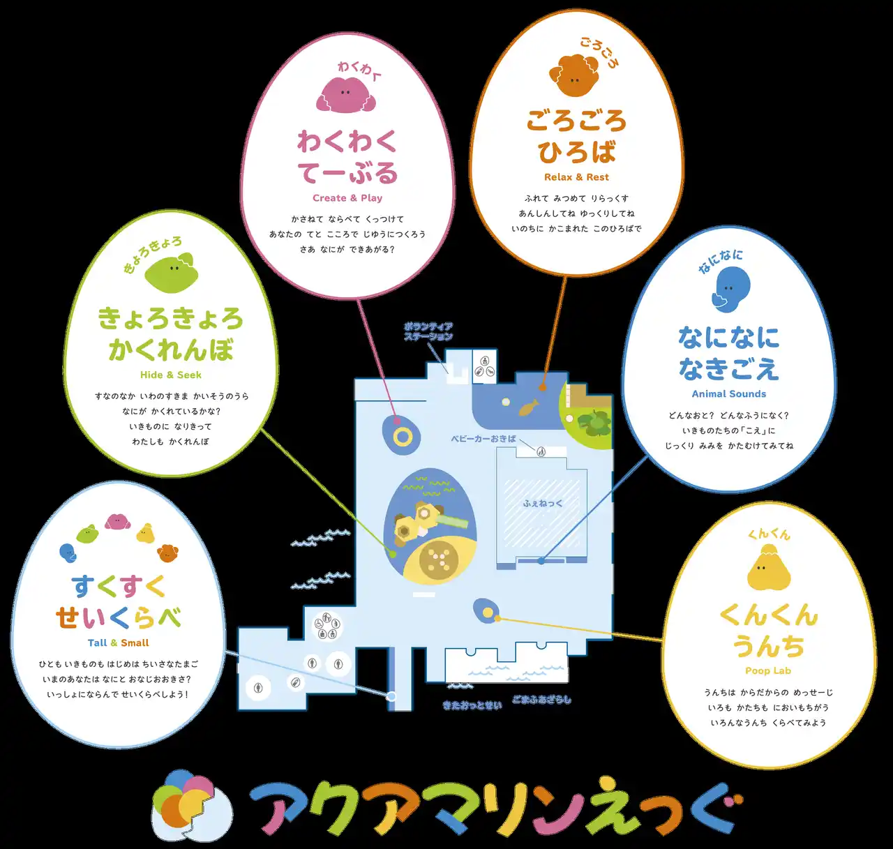 新しい「アクアマリンえっぐ」は、 「あそび」と「まなび」がちりばめられた6つのゾーンが広がり、五感を使って生き物たちの生きる工夫「いのちのアイデア」を体験できる幼い子どもたち向けのコーナーです。本コーナーには、以下の2つの特徴があります。 |